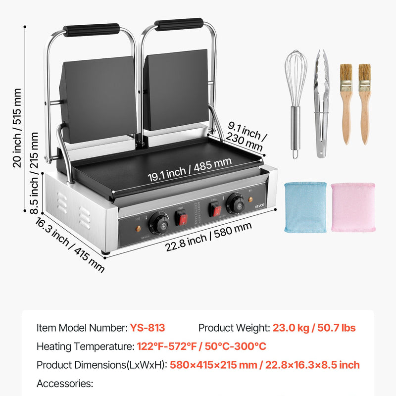 Венмерига ун атра узсильдишана: апрекотс ар биезинатэм силдкаурулэм, электрискайс свяэстмайжу панини грилс венмериги ун эфективи узсильда 485 × 230 мм гатавошанас вирсму. Augšējās un apakšējās restes uzkarst vienlaikus, nodrošinot efektīvu gatavošanu.