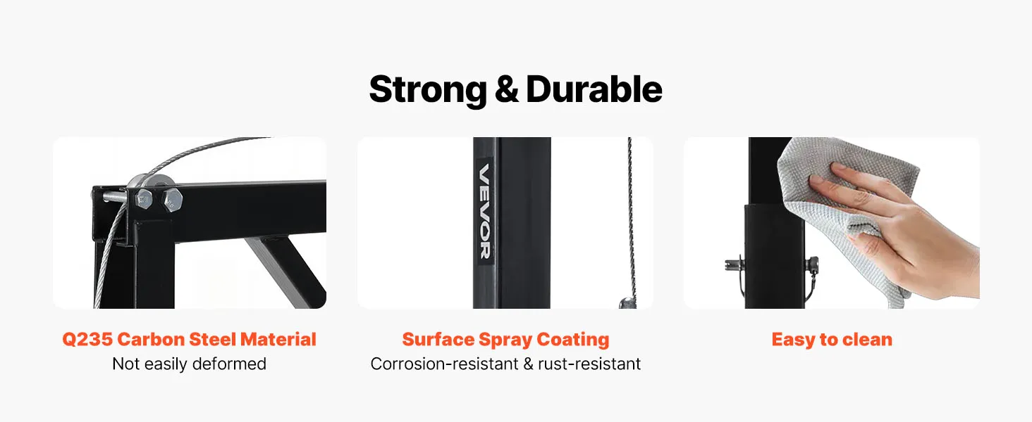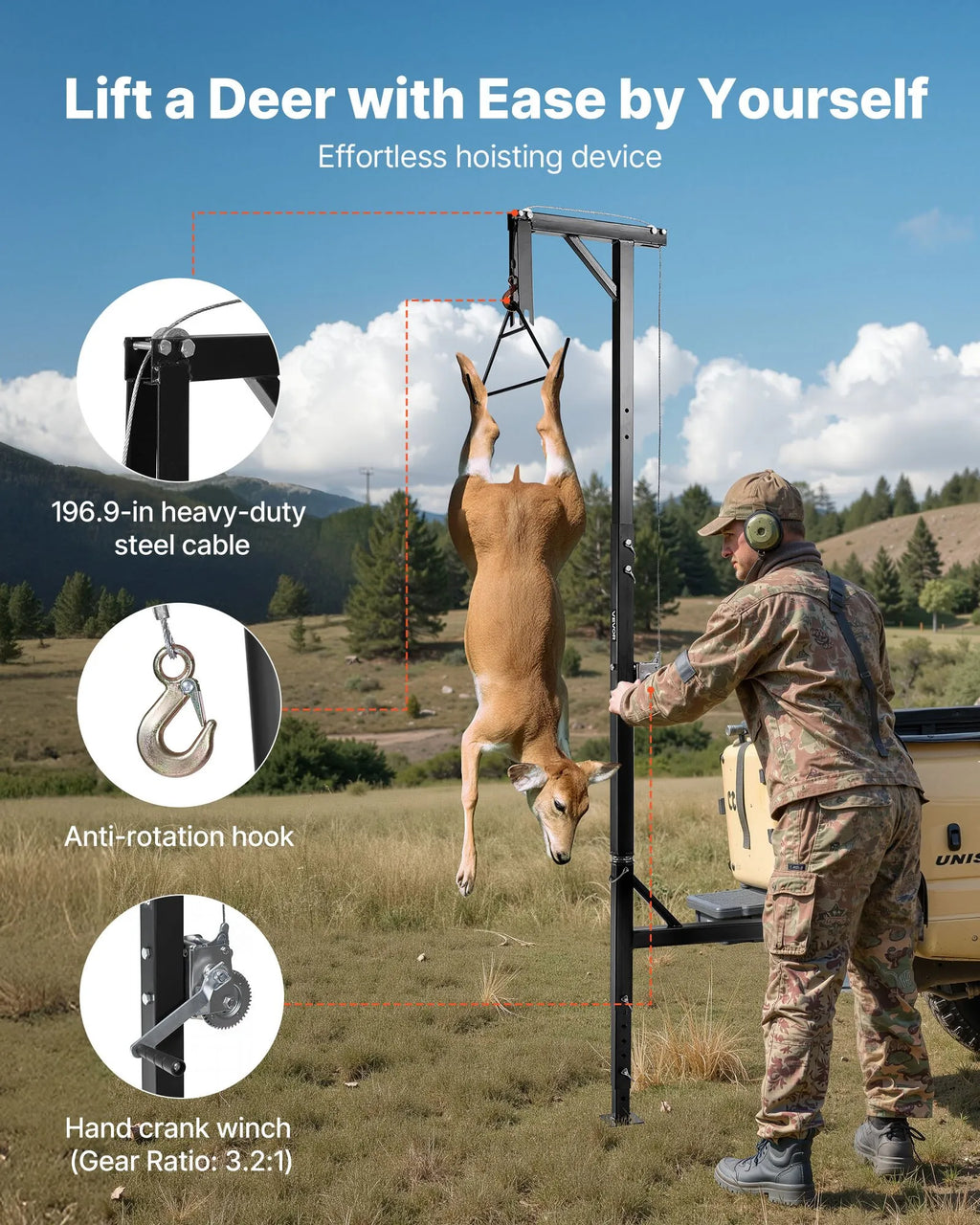Liela celtspēja: Mūsu medījuma pacēlājs viegli paceļ līdz 227 kg ar regulējamu augstumu no 1870 līdz 2540 mm, ideāli piemērots dažādu medījumu, piemēram, briežu, cūku, vilku, lāču un lapsu pacelšanai.