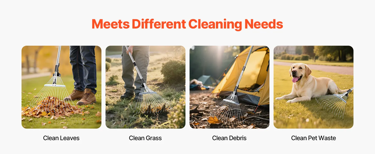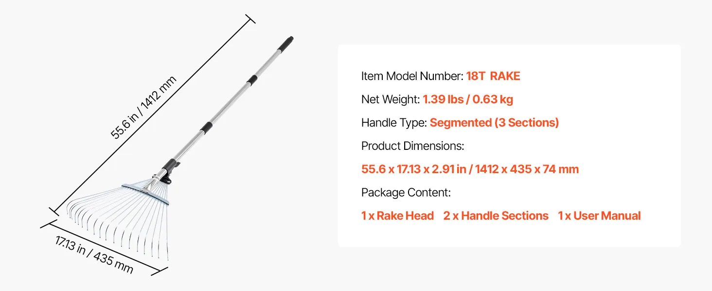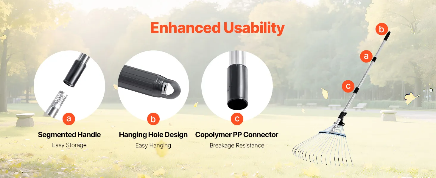 Izturīgs un nerūsējošs: 18 zobi izgatavoti no 72A atsperu tērauda stieples, kas neplīst un nesaliecas. Grābeklis iztur sauli un lietu, nerūsējot, neatkarīgi no tā, vai tas tiek glabāts pie šķūņa vai atstāts uz terases.