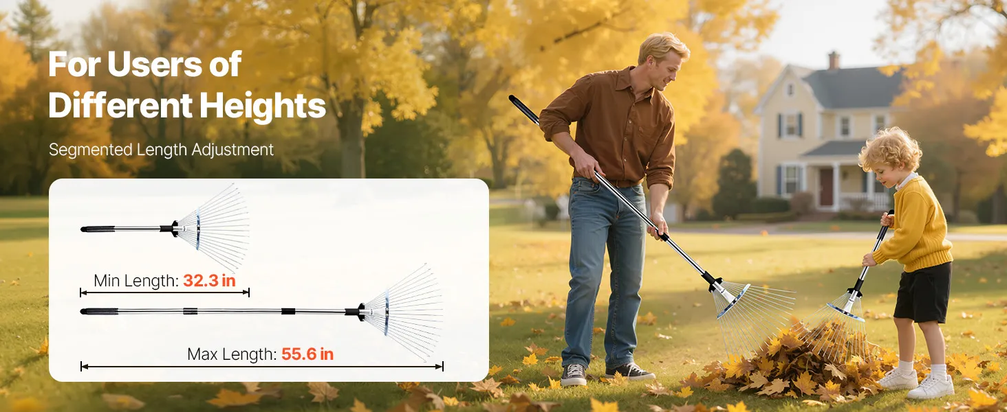 Elastīgs garums: Metāla grābeklim ir segmentēts rokturis, kuru var regulēt no 82 līdz 141 cm, nodrošinot ērtu lietošanu jebkura auguma cilvēkam un dažādiem grābšanas stiliem.