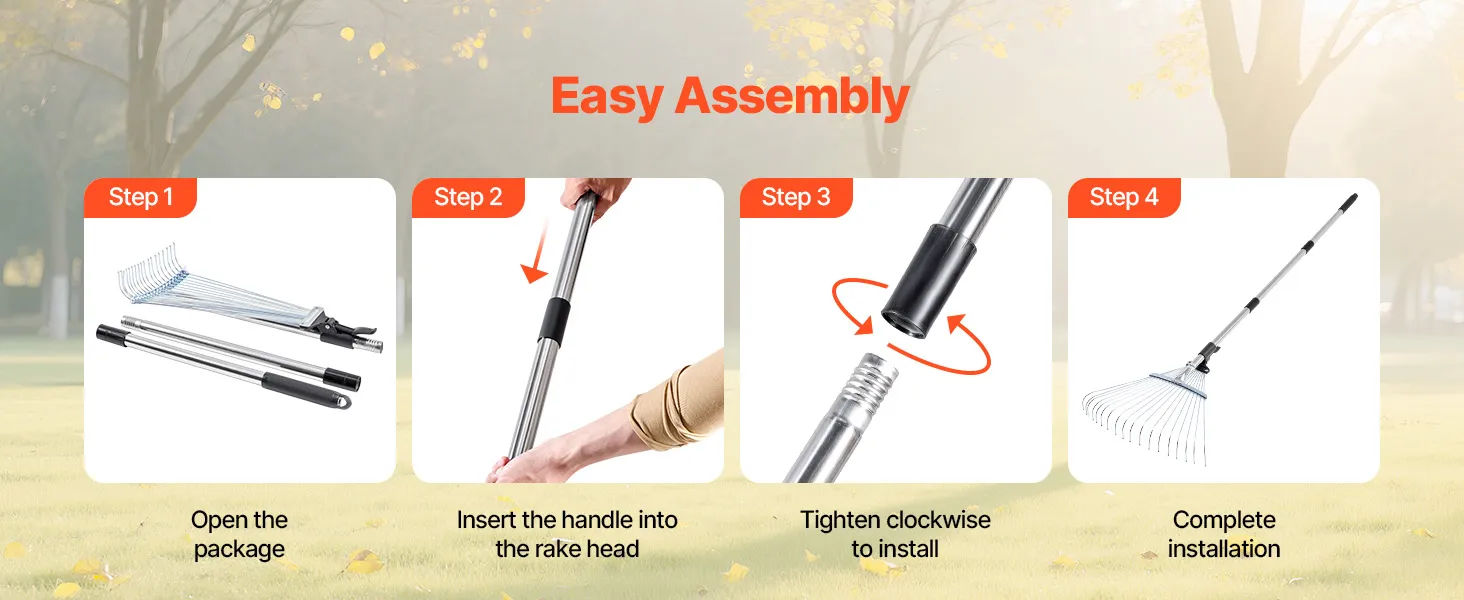 Pārnēsājams un viegli uzglabājams: Instrumenti nav nepieciešami - ātri saliekams un izjaucams. Salocītā veidā grābeklis ir kompakts un viegli ievietojams bagāžniekā vai uzglabāšanas skapī. Lieliski piemērots lietošanai dārzā, pagalmā, kempingā vai atpūtas vietās.