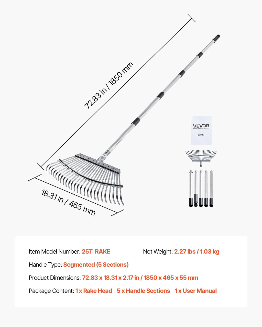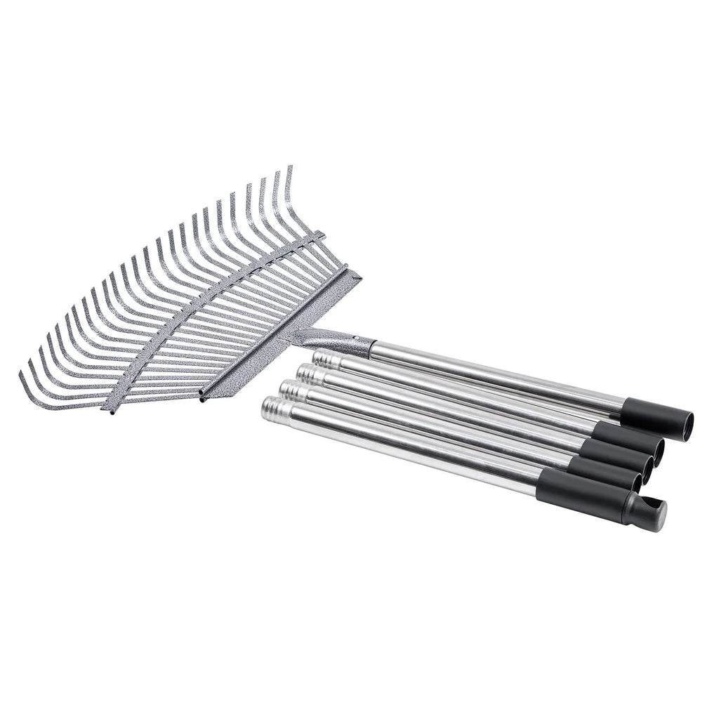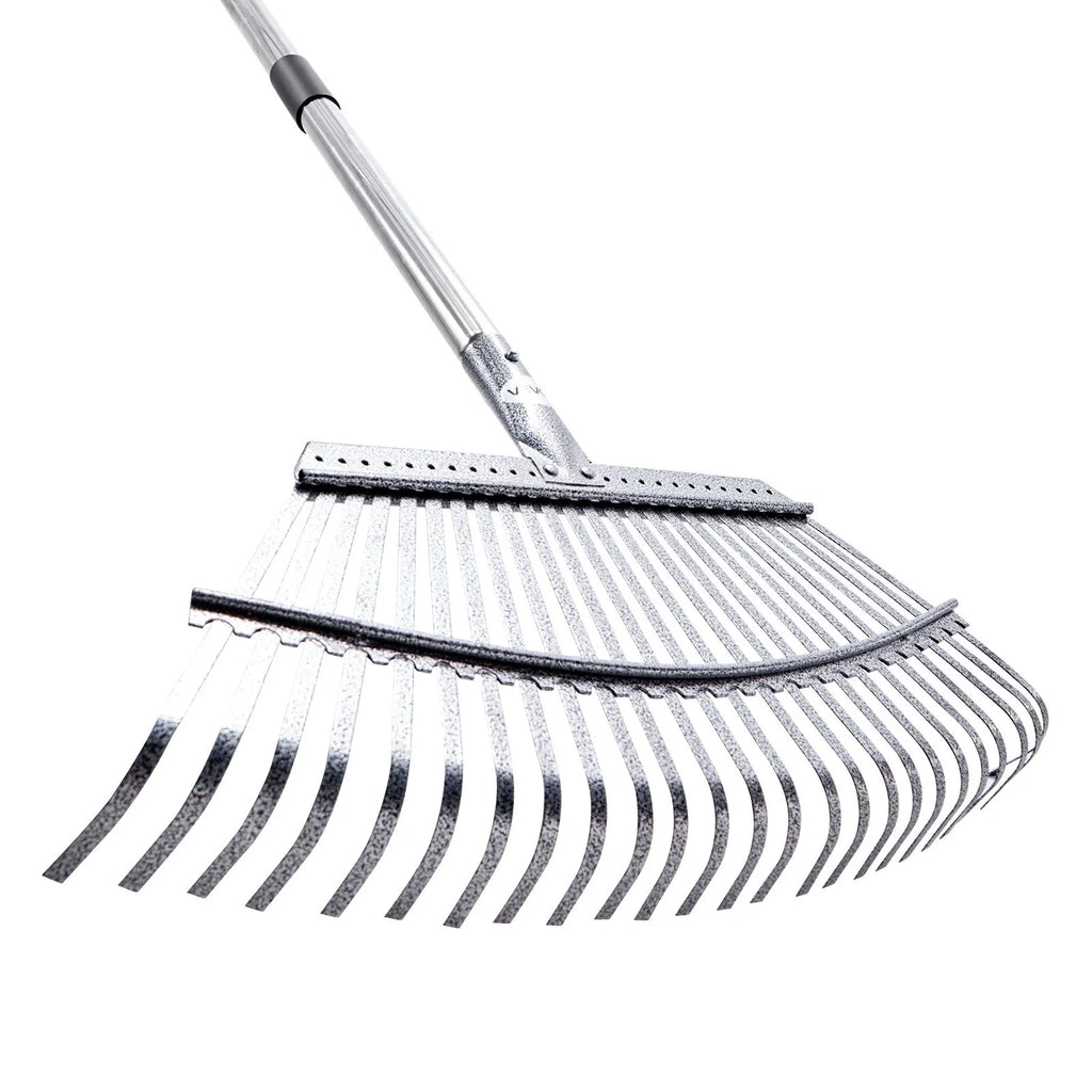 25 izturīgi metāla zobi: Izgatavoti no augstas kvalitātes nerūsējošā tērauda, zobi ir izvietoti cieši - ar 0,7 cm atstarpēm -, lai izturētu saliekšanos un rūsēšanu. Dārza grābeklis paredzēts smagu slodžu savākšanai bez deformācijas pat pēc ilgstošas lietošanas ārā.