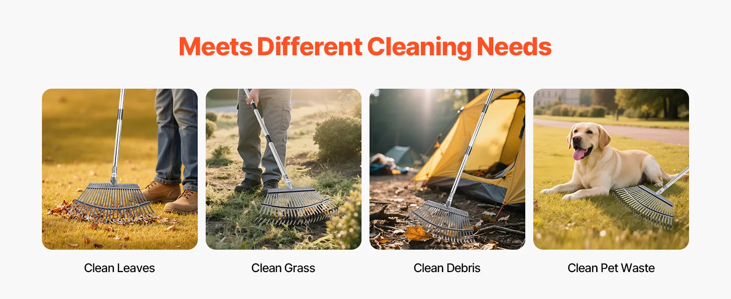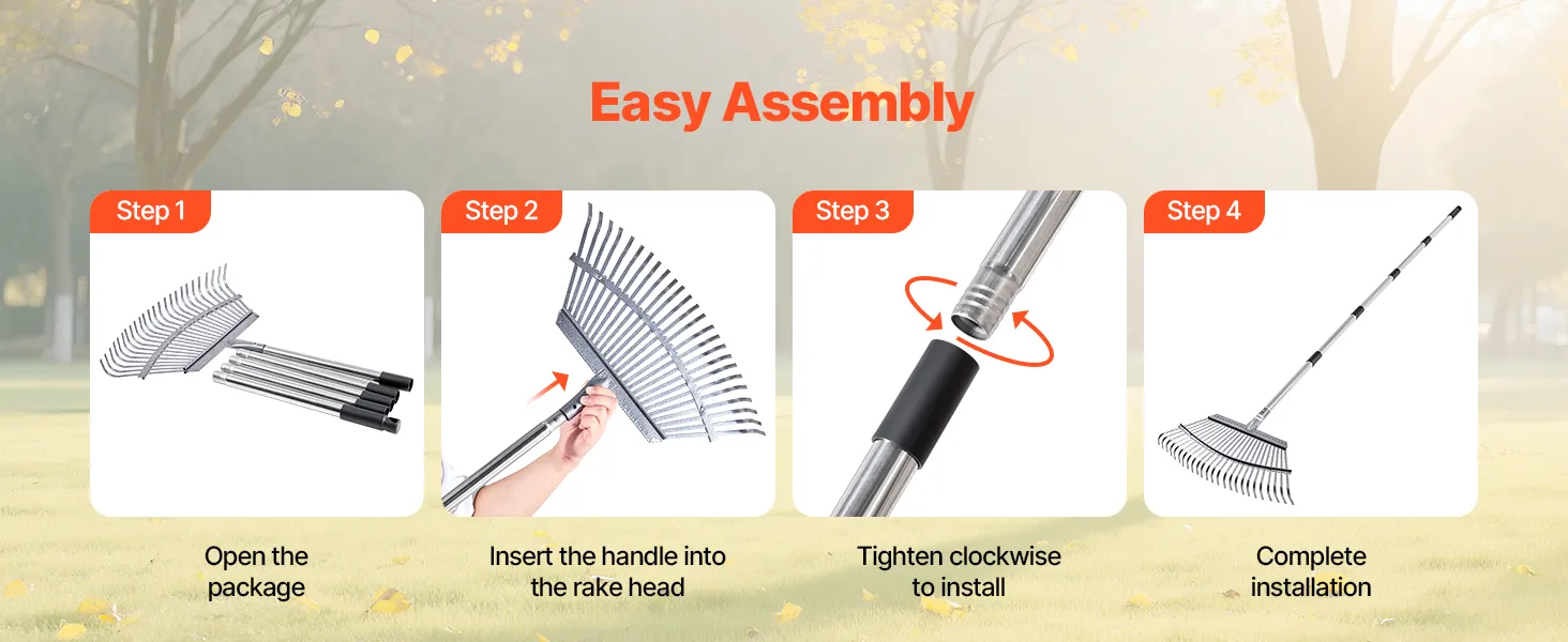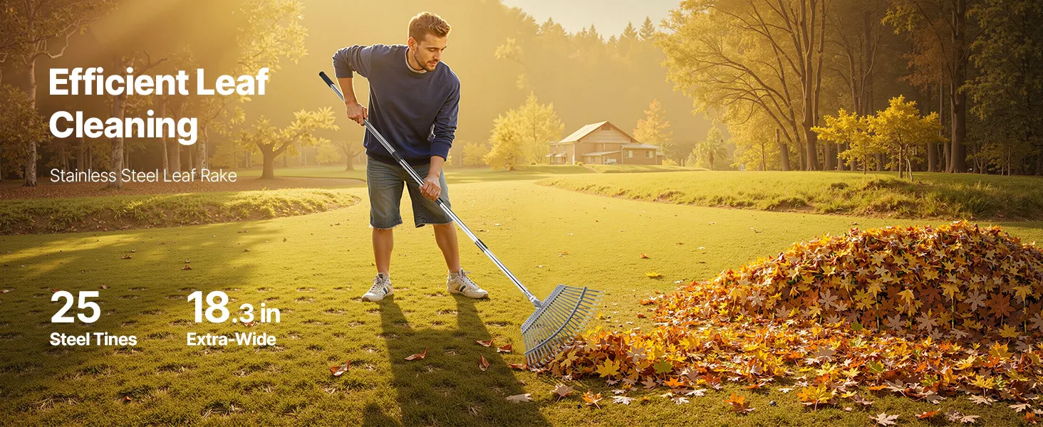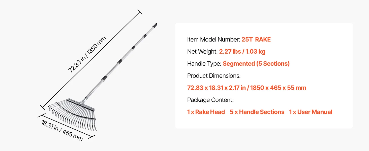 25 izturīgi metāla zobi: Izgatavoti no augstas kvalitātes nerūsējošā tērauda, zobi ir izvietoti cieši - ar 0,7 cm atstarpēm -, lai izturētu saliekšanos un rūsēšanu. Dārza grābeklis paredzēts smagu slodžu savākšanai bez deformācijas pat pēc ilgstošas lietošanas ārā.
