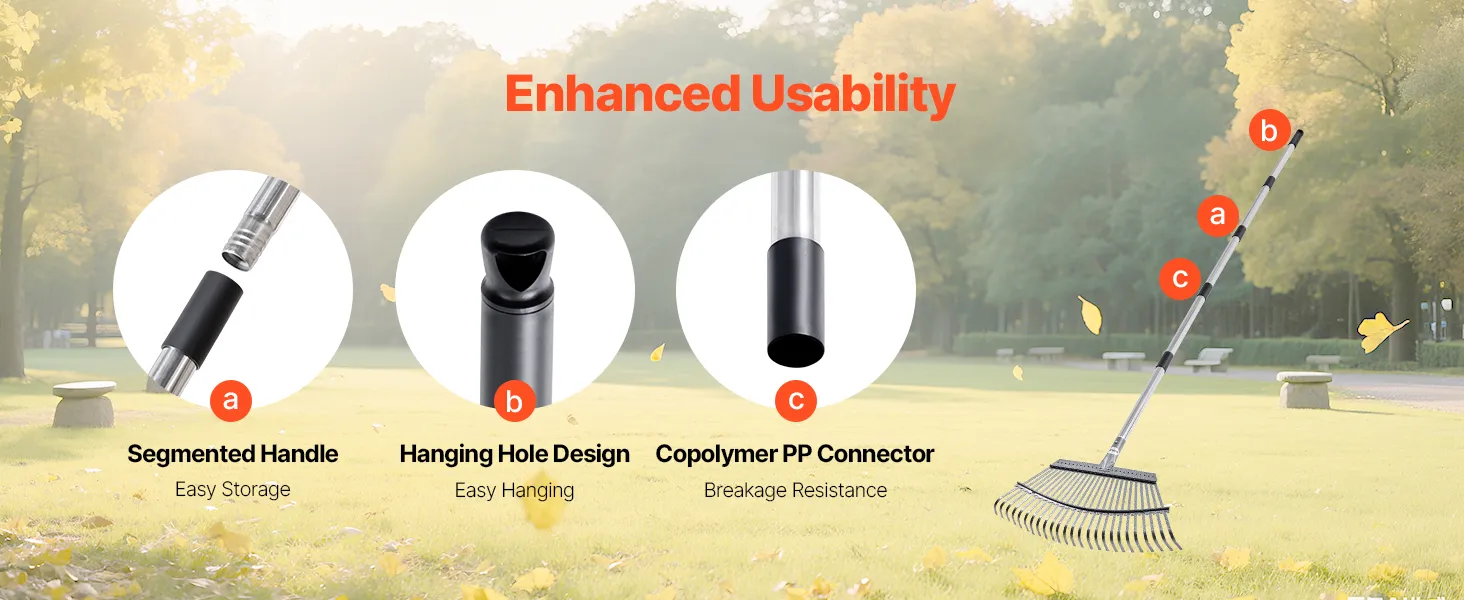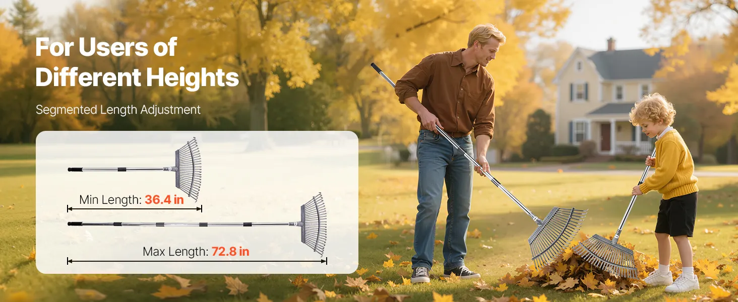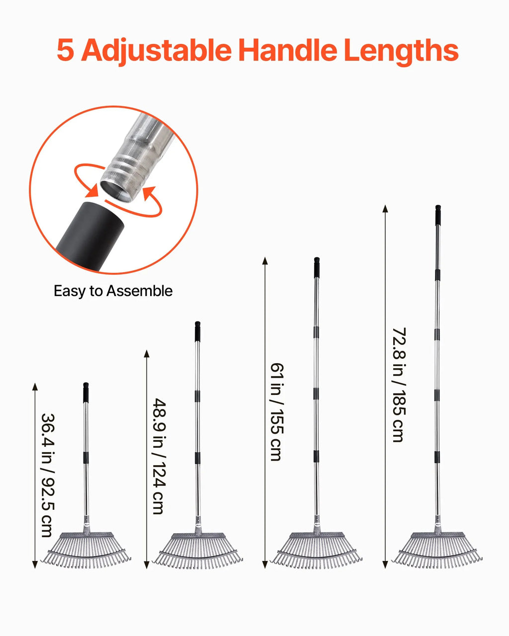 Регулярные гарумы: Metāla lapu grābeklim ir segmentēts rokturis, kuru var regulēt no 92,5 līdz 185 cm, ļaujot atrast ērtāko garumu jebkura auguma lietotājam un dažādiem grābšanas stiliem.