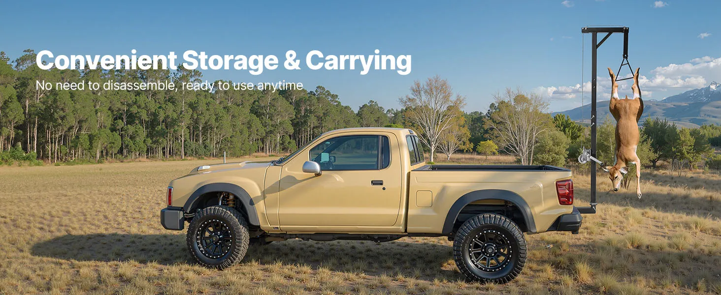 Elastīga regulēšana: Balsta rāmis griežas par 360°, kas ļauj vienai personai ērti novietot medījumu uz rāmja, nepārvietojot transportlīdzekli.