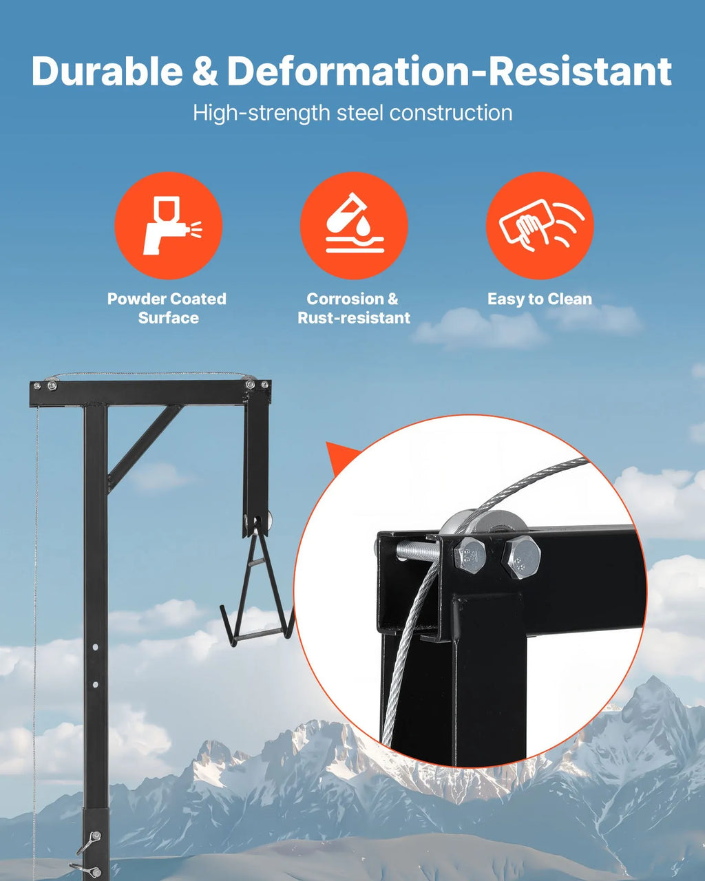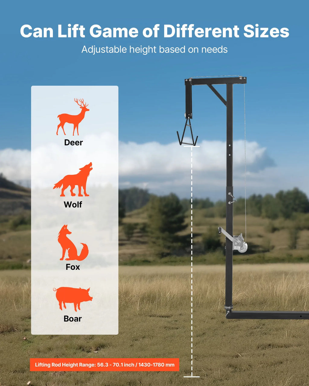 Liela celtspēja: Medījuma pacēlājs spēj viegli pacelt līdz 136 kg, ar regulējamu augstumu no 1430 līdz 1780 mm, piemērots dažādu medījumu – briežu, mežacūku, vilku, lāču un lapsu – pacelšanai.