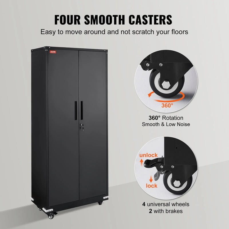 Viegla pārvietošana: Metāla skapis ar slēdzeni aprīkots ar četriem gludi rotējošiem ritenīšiem, kas ļauj to viegli pārvietot pat tad, ja tas ir pilnībā piekrauts. Ritenīši neskrāpē un neatstāj pēdas uz grīdas. Papildu drošībai divus no tiem iespējams fiksēt, nodrošinot stabilu novietojumu.