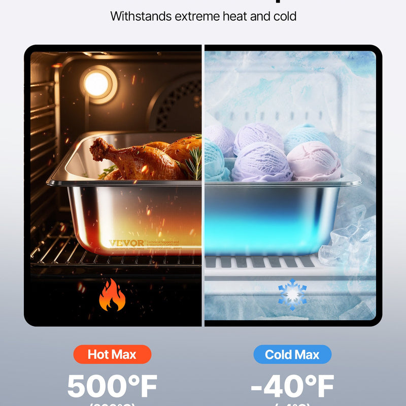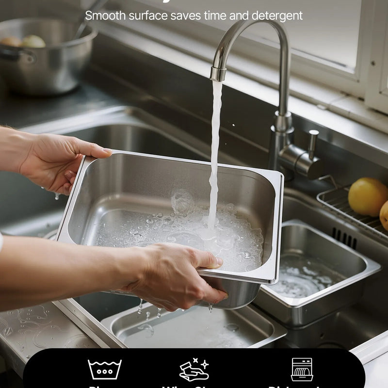 Komercklases nerūsējošais tērauds: mūsu nerūsējošā tērauda gastronomijas trauks ir izgatavots no komercklases 22-gabarīta SS201 nerūsējošā tērauda, kas nodrošina ilgmūžību un lielisku izturību pret rūsu. Ideāli piemērots gan karstiem, gan aukstiem ēdieniem un iztur temperatūras no -4 °C līdz 260 °C. Piemērots izmantošanai augsttemperatūras profesionālajās trauku mazgājamajās mašīnās, ledusskapjos, saldētavās un citur.