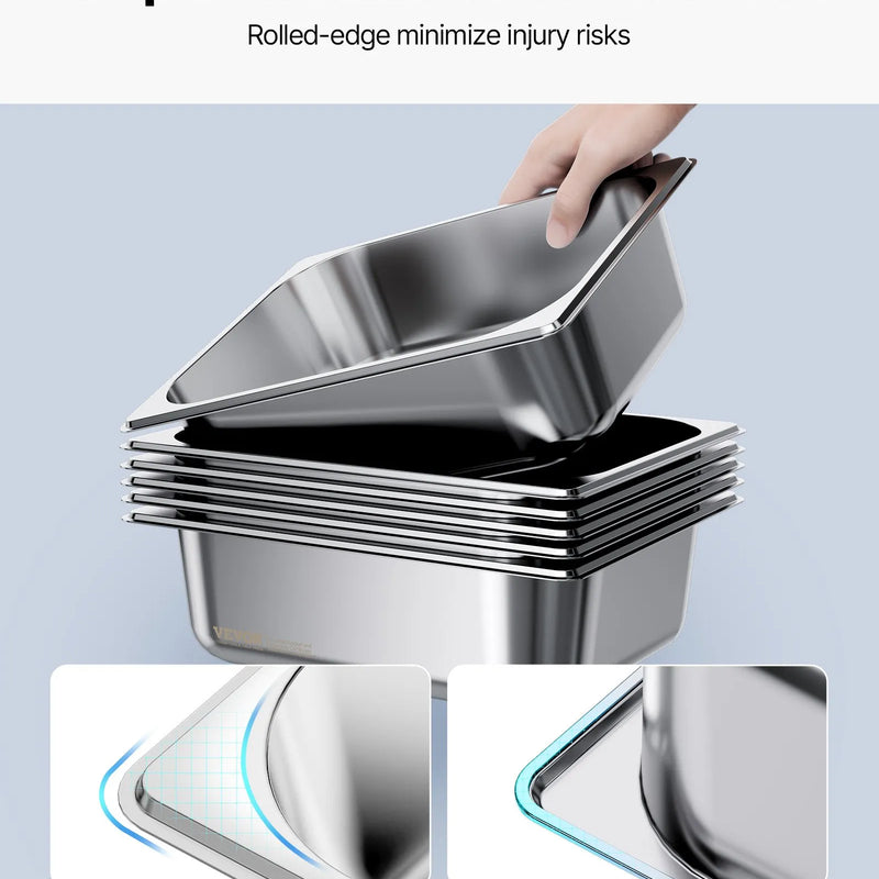 Šis tvaika trauks ir izgatavots no komercklases 22-gabarīta SS201 nerūsējošā tērauda, kas nodrošina izturību un aizsardzību pret rūsu. 1/2 izmēra trauks ar 98 mm dziļumu, 6 gabalu komplekts, atbilst ikdienas gatavošanas vajadzībām un ir ideāli piemērots ēdiena gatavošanai, uzglabāšanai un pasniegšanai, piemēram, gaļai, dārzeņiem, augļiem un pat saldējumam.