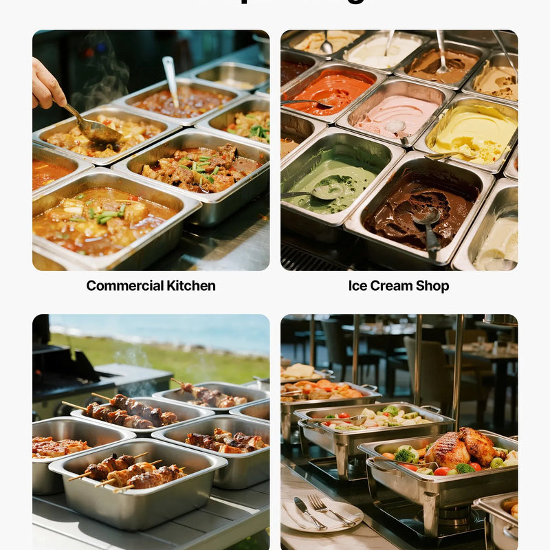 Pārdomāts dizains: šis nerūsējošā tērauda trauks ir ideāli piemērots kāzām, svinībām, restorāniem un viesnīcām. Neatkarīgi no tā, vai gatavojat ēdienu lielai ģimenei vai vadāt ēdināšanas uzņēmumu, komplekts nodrošina plašu pielietojumu ēdiena gatavošanā un pasniegšanā.