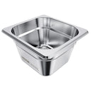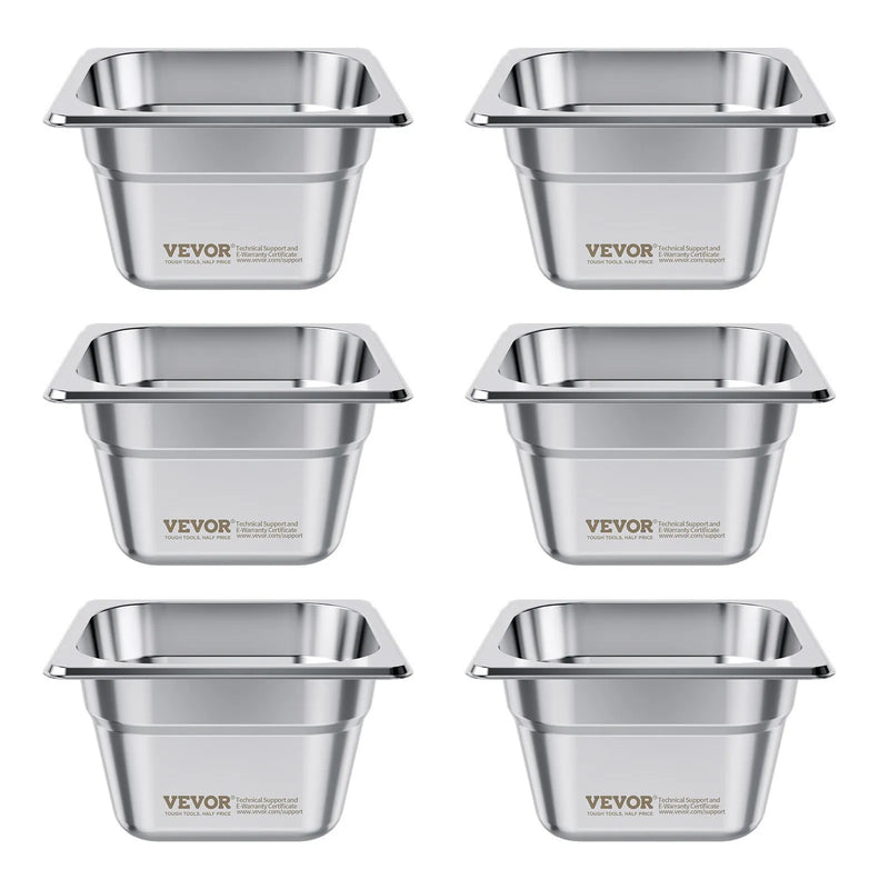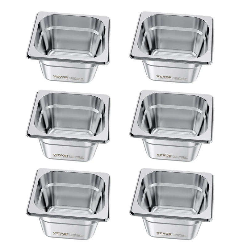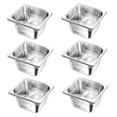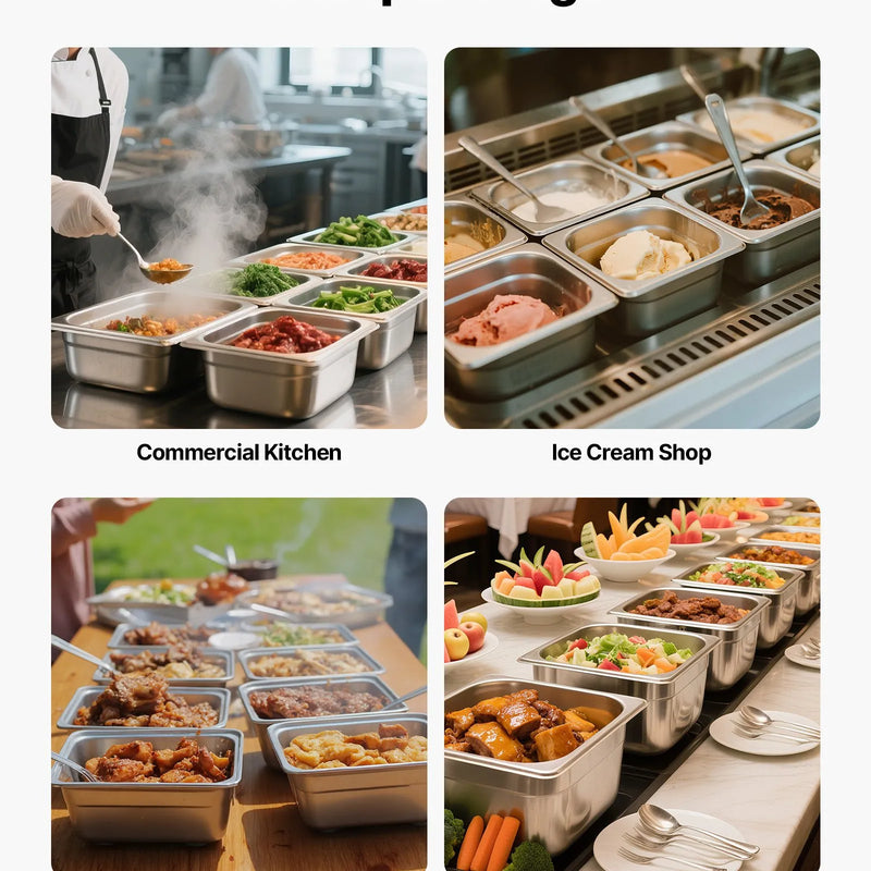 Plaša ietilpība: šis 1/6 izmēra nerūsējošā tērauda gastronomijas trauku komplekts (dziļums 100 mm, 6 gabali) nodrošina 1,7 l ietilpību, kas atbilst ikdienas gatavošanas vajadzībām. Ideāli piemērots ēdiena gatavošanai, uzglabāšanai un pasniegšanai - gaļai, dārzeņiem, augļiem, saldējumam un citiem produktiem.