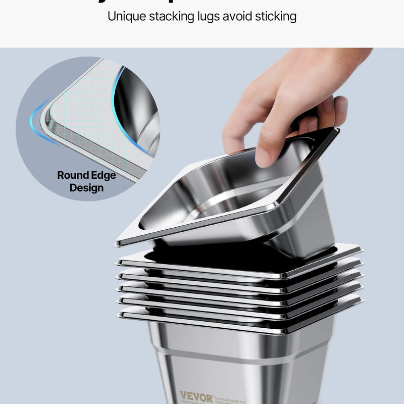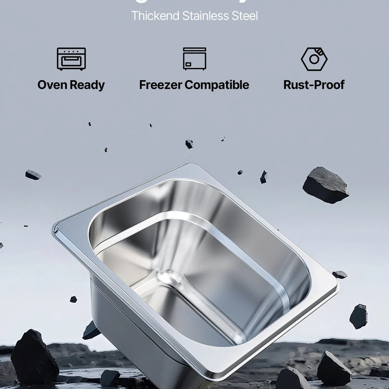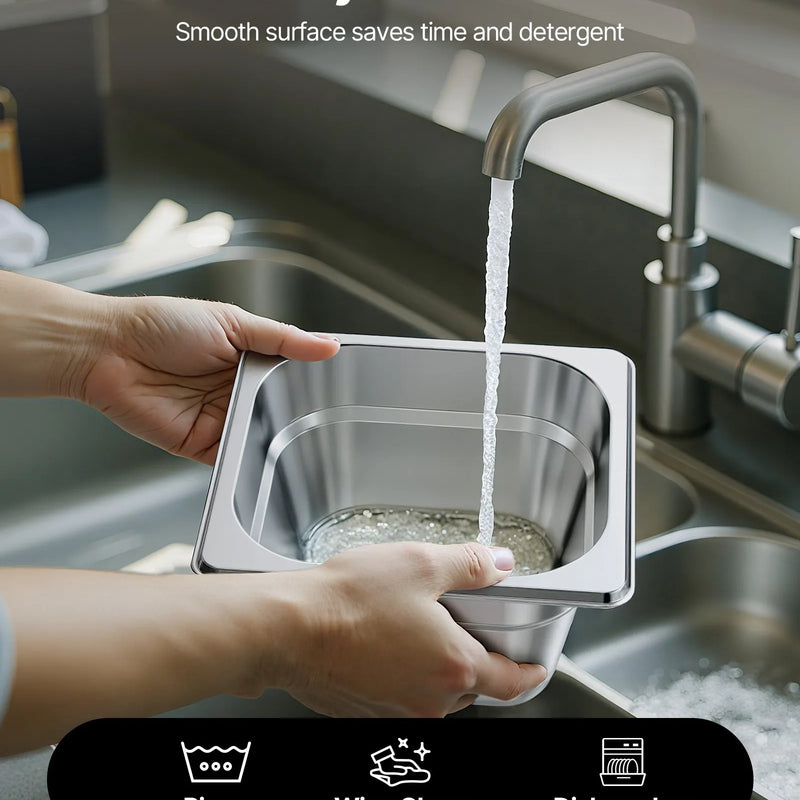 Komercklases nerūsējošais tērauds: mūsu nerūsējošā tērauda gastronomijas trauks ir izgatavots no komercklases 22-gabarīta SS201 nerūsējošā tērauda, kas nodrošina ilgmūžību un lielisku izturību pret rūsu. Ideāli piemērots gan karstiem, gan aukstiem ēdieniem un iztur temperatūras no -4 °C līdz 260 °C. Piemērots izmantošanai augsttemperatūras profesionālajās trauku mazgājamajās mašīnās, ledusskapjos, saldētavās un citur.