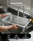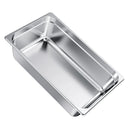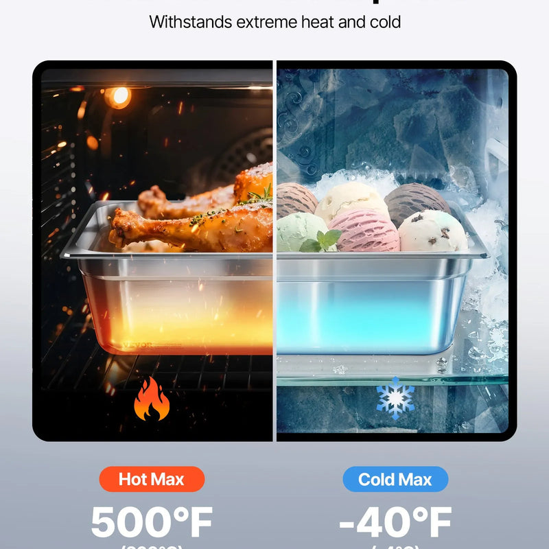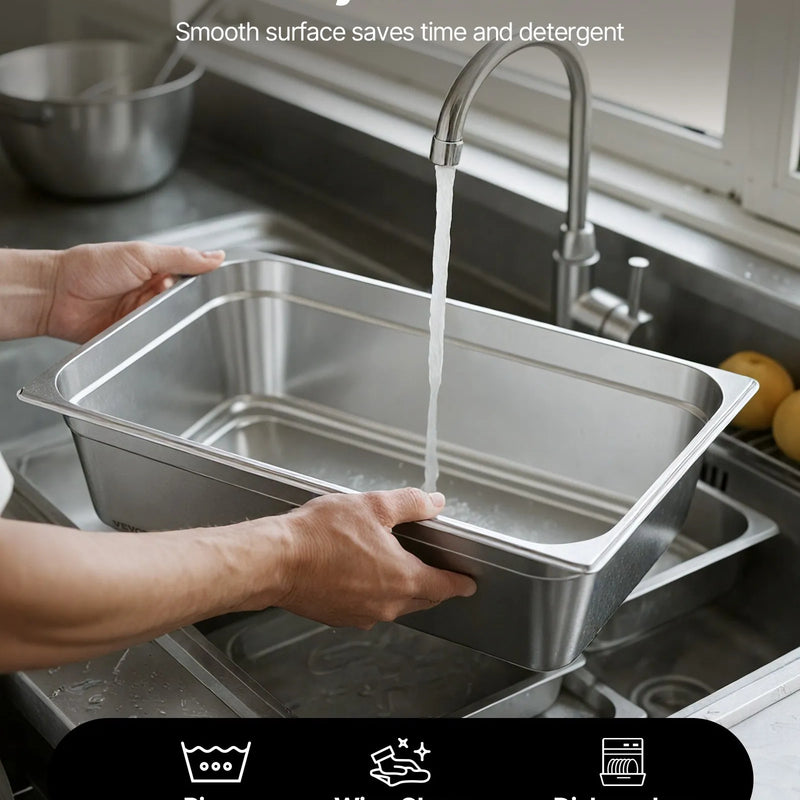 Komercklases nerūsējošais tērauds: mūsu nerūsējošā tērauda gastronomijas trauks ir izgatavots no komercklases 22-gabarīta SS201 nerūsējošā tērauda, kas nodrošina ilgmūžību un lielisku izturību pret rūsu. Ideāli piemērots gan karstiem, gan aukstiem ēdieniem un iztur temperatūras no -4 °C līdz 260 °C. Piemērots izmantošanai augsttemperatūras profesionālajās trauku mazgājamajās mašīnās, ledusskapjos, saldētavās un citur.