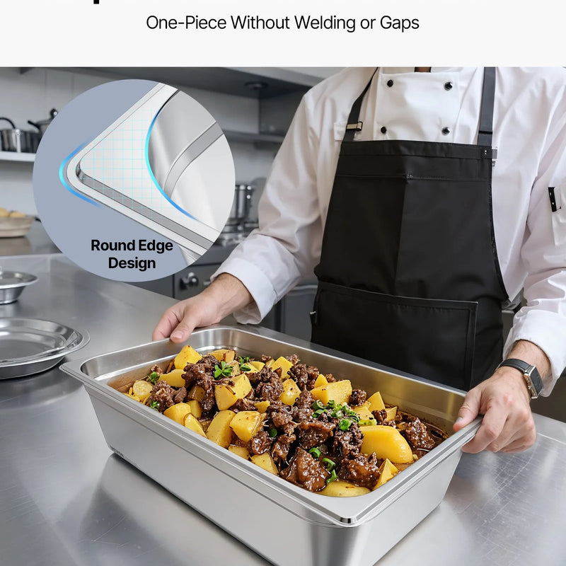 Gludas malas: šim nerūsējošā tērauda traukam ir viengabala konstrukcija ar gludām malām, kas pasargā rokas no saskrāpēšanās lietošanas vai tīrīšanas laikā. Matētā elektrolītiskā apdare piešķir modernu un profesionālu izskatu, kas lieliski piemērots ēdināšanas uzņēmumiem, bufetes līnijām un profesionālām virtuvēm.