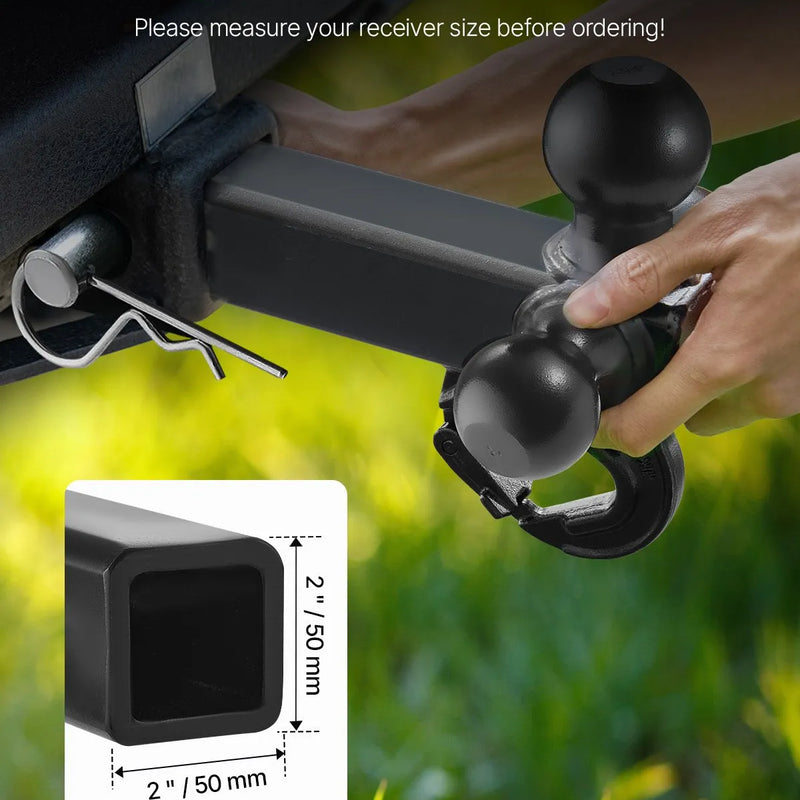 Saderīgs ar dažādiem transportlīdzekļiem: Piekabes āķis izmanto standarta 50 mm uztvērēju, kas lieliski der piekabēm, laivām, kemperiem, lopu pārvadāšanas piekabēm, atpūtas piekabēm, bezceļu transportlīdzekļiem, kvadricikliem, motocikliem, aizmugures bamperiem, lauksaimniecības tehnikai un dubultajiem uztvērēju pagarinātājiem. Pirms iegādes pārliecinieties par atbilstību izmēram.