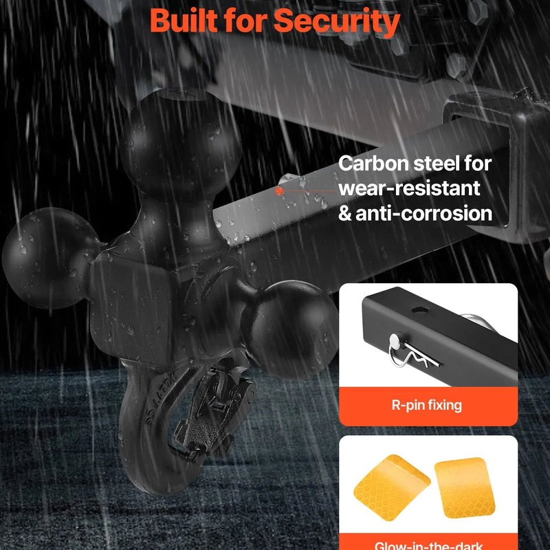 Pretzagļu drošība: Tapas un R-tapas mehānisms droši fiksē ierīci, novēršot nejaušu piekabes lodveida āķa atvienošanos un saglabājot piekabes stabilitāti. Gaismu atstarojošā brīdinājuma uzlīme nodrošina drošību nakts apstākļos, garantējot drošāku un ērtāku braukšanu.