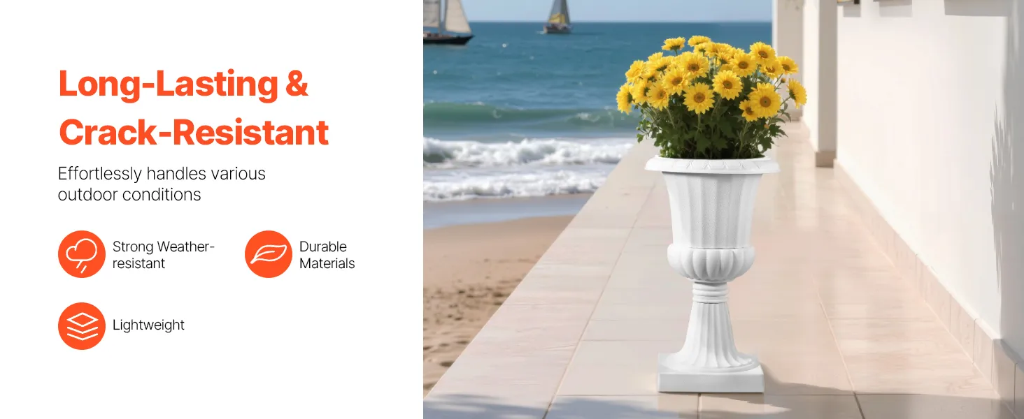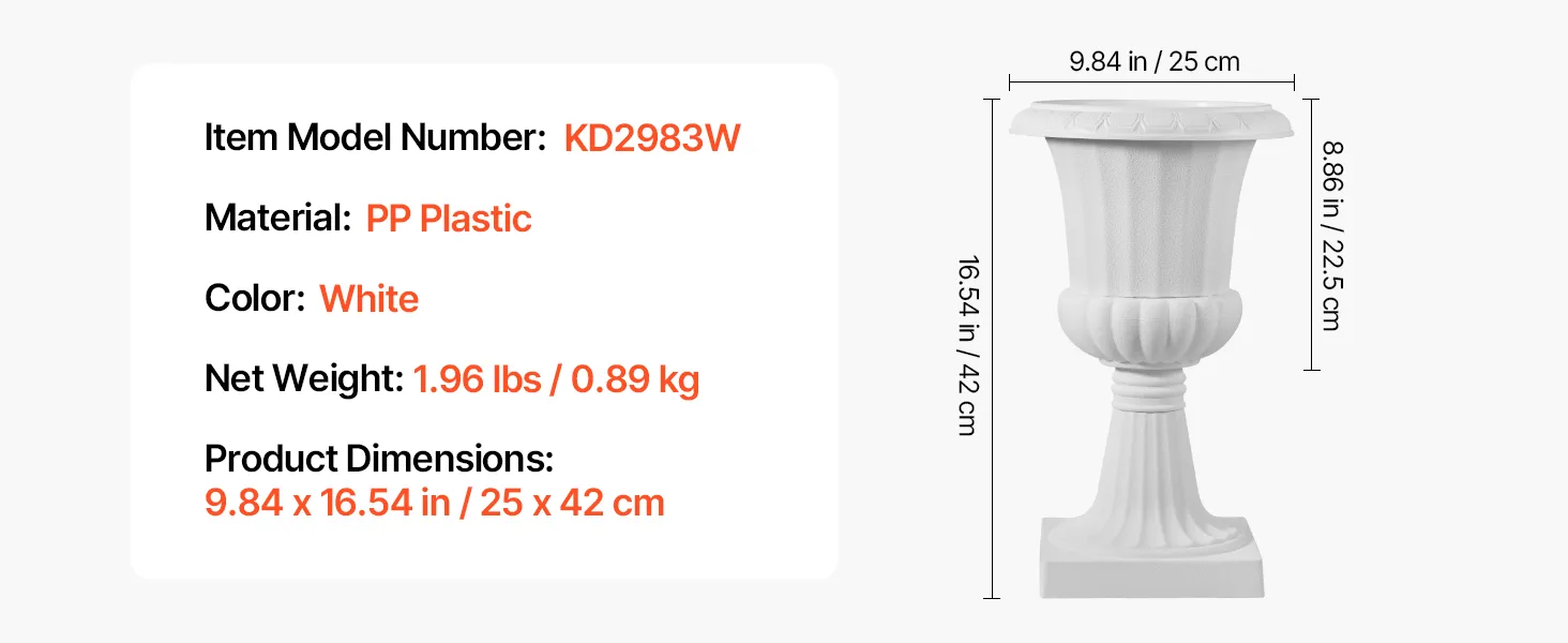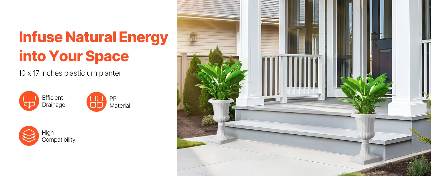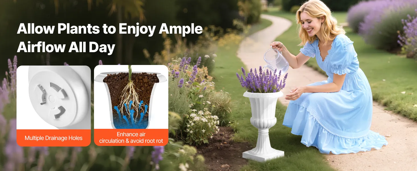 Ar vairākām drenāžas atverēm šis urnas formas pods veicina gaisa cirkulāciju un ātru ūdens novadīšanu, saglabājot augu saknes svaigas un veselīgas visas dienas garumā, palīdzot tiem augt un attīstīties.