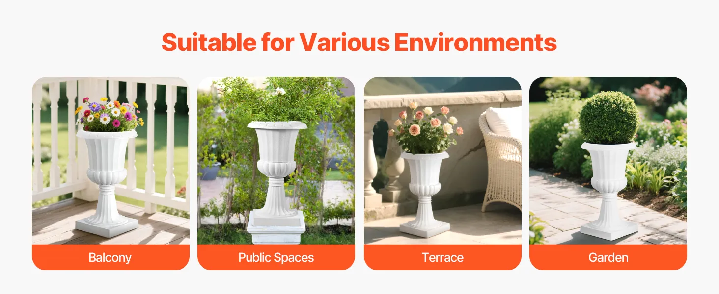 Daudzpusīga izmantošana: stilīgais un praktiskais klasisko ziedu podu dizains lieliski iederas pie ieejas durvīm, dārzos un terasēs, izceļot jebkuras telpas dabisko skaistumu un nodrošinot funkcionālu vietu augiem.