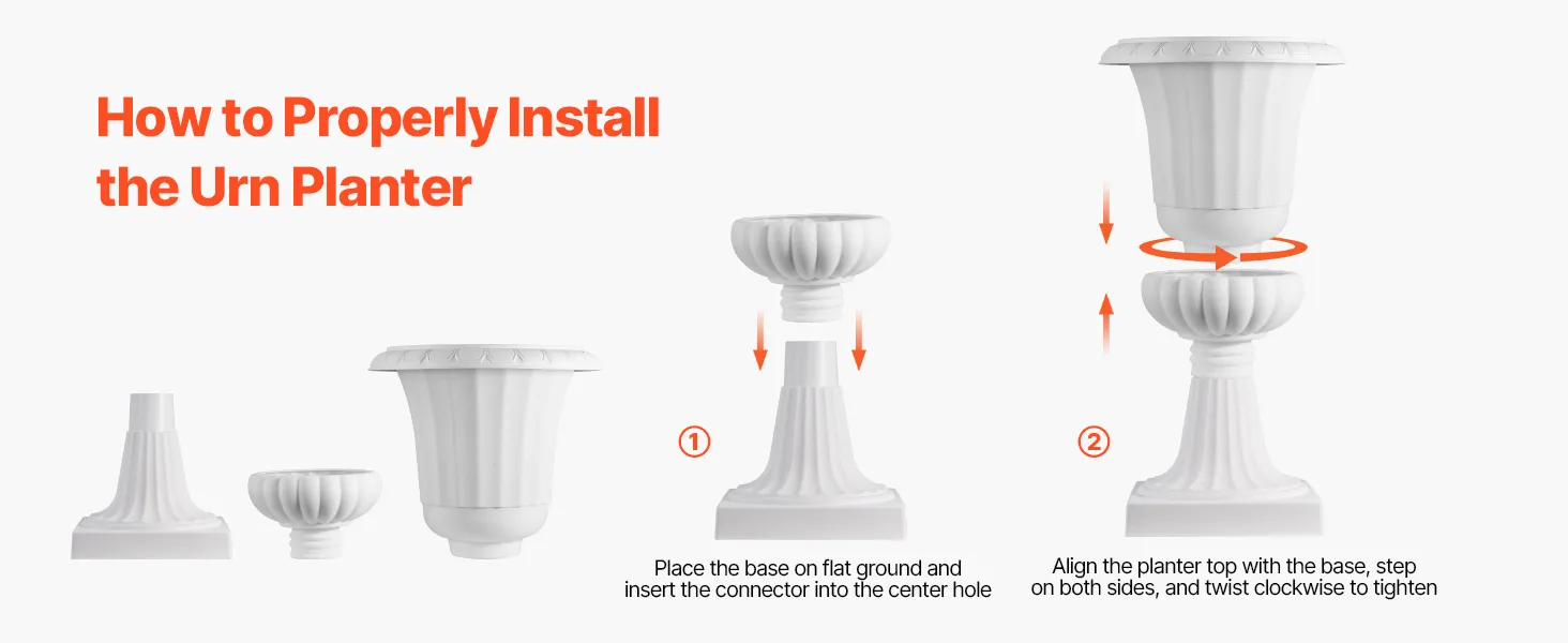Nav nepieciešami instrumenti! Vienkārši novietojiet pamatni, ievietojiet savienotāju, uzlieciet podu un cieši pagrieziet. Dekoratīvais pods ir gatavs lietošanai tikai divos vienkāršos soļos, lai Jūs varētu uzreiz sākt stādīšanu.