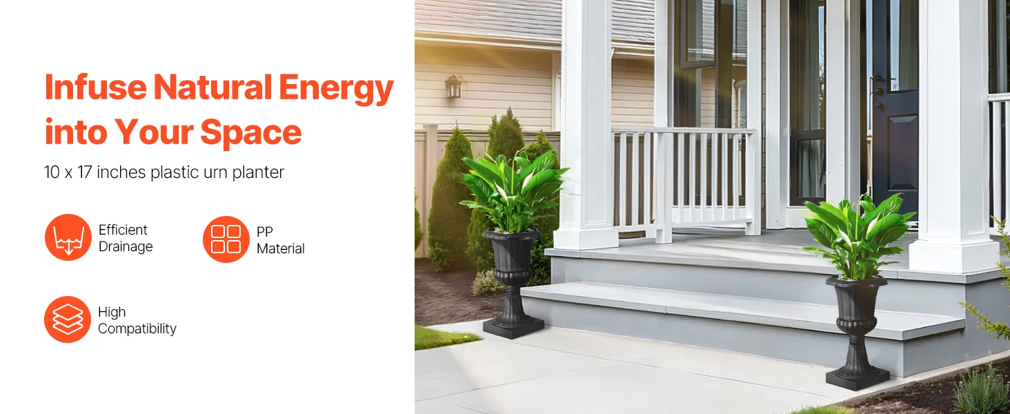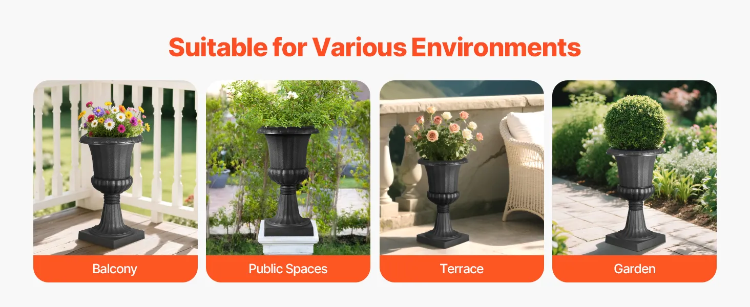 Daudzpusīga izmantošana: stilīgais un praktiskais klasisko ziedu podu dizains lieliski iederas pie ieejas durvīm, dārzos un terasēs, izceļot jebkuras telpas dabisko skaistumu un nodrošinot funkcionālu vietu augiem.