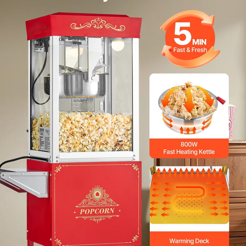 Retro 8 oz popkorna mašīna: šai popkorna mašīnai ar ratiņiem ir 0,2 kg katls, kas vienā reizē var pagatavot līdz 48 porcijām popkorna, pietiekami 6-8 cilvēkiem. Lieliski piemērota sporta faniem un ballīšu viesiem.