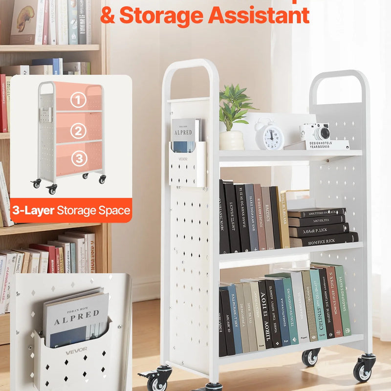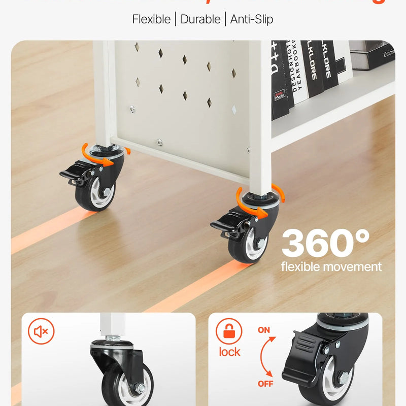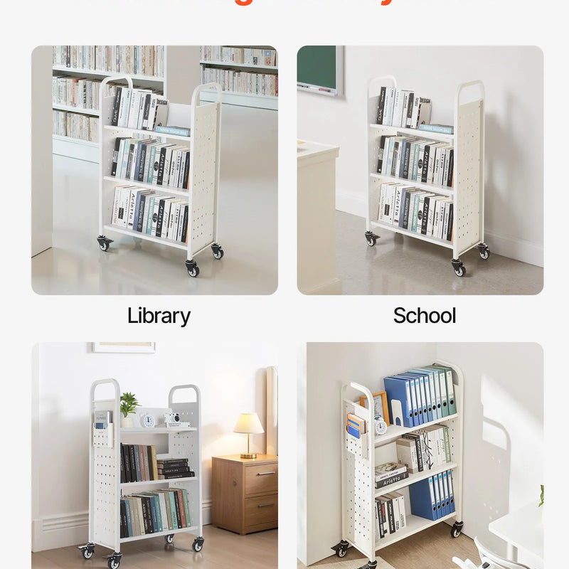 Daudzpusīga izmantošana: ideāli piemēroti bibliotēku plauktu papildināšanai, skolas piederumu pārvietošanai, biroja dokumentu izdalīšanai vai grāmatu un priekšmetu kārtošanai mājās. Šie ripojošie grāmatu plaukti būs lielisks palīgs darbam un mājām