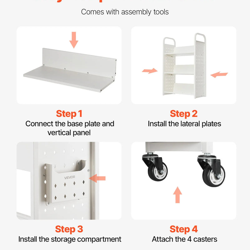 Ātra uzstādīšana: nav nepieciešami sarežģīti instrumenti. Bibliotēkas ratiņi ir viegli samontējami, pateicoties iepriekš izurbtajām atverēm. Комплект иекļauta uzstādīšanas instrukcija un papildu skrūves ērtākai montāžai