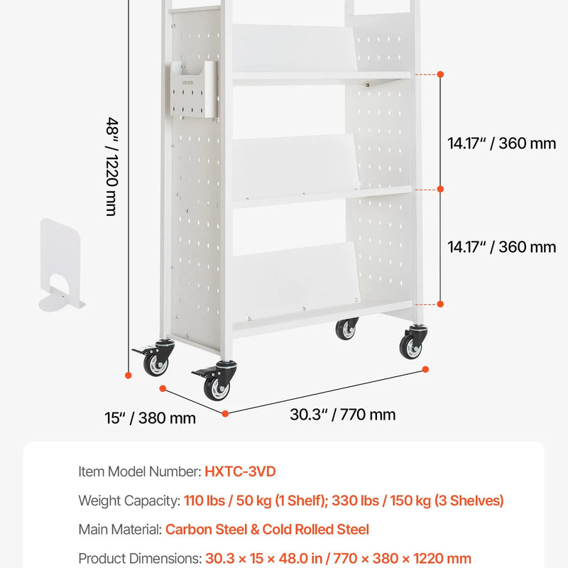 Ļoti liela ietilpība: šiem 3 līmeņu grāmatu ratiņiem ar 360 mm augstiem plauktiem ir liela vieta grāmatām vai biroja piederumiem. Aprīkoti arī ar sānu nodalījumiem A4 mapēm vai planšetēm - ideāli bibliotēkām, mājām un citām vajadzībām