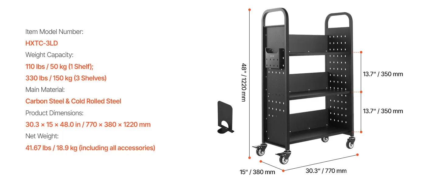 Ļoti liela ietilpība: šiem 3 līmeņu grāmatu ratiņiem ar 350 mm augstiem plauktiem ir plaša vieta grāmatām vai biroja piederumiem. Tie aprīkoti arī ar sānu nodalījumiem A4 mapēm vai planšetēm - ideāli bibliotēkām, mājām un citām vajadzībām