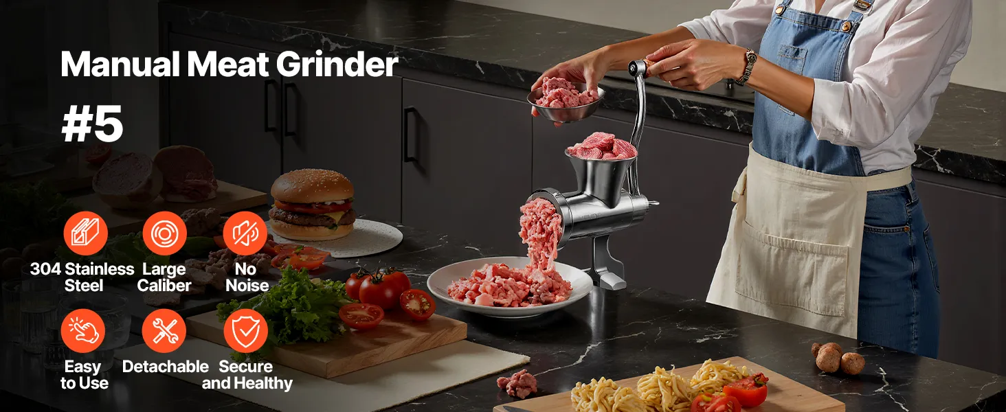 Izturīgs 304 nerūsējošais tērauds: Izgatavota no augstākās kvalitātes 304 nerūsējošā tērauda, šī rokas gaļas maļamā mašīna ir izturīga pret rūsu un oksidēšanos, nodrošinot ilgmūžīgu lietošanu. Pārtikai drošs materiāls, ideāli piemērots svaigu un veselīgu maltīšu pagatavošanai ģimenei un mājdzīvniekiem.