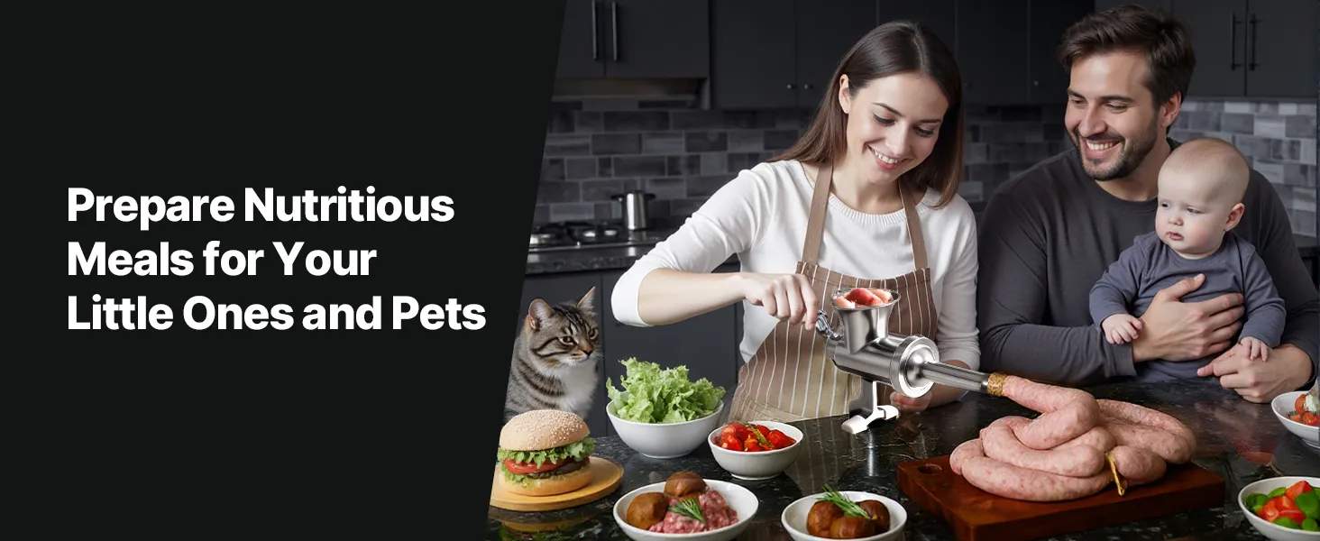 Galda stiprinājuma gaļas maļamā mašīna ir ideāli piemērota ne tikai cilvēku ēdiena pagatavošanai, bet arī svaigu un veselīgu maltīšu sagatavošanai mājdzīvniekiem, tostarp kaķiem un suņiem, nodrošinot viņu uztura pilnvērtību.