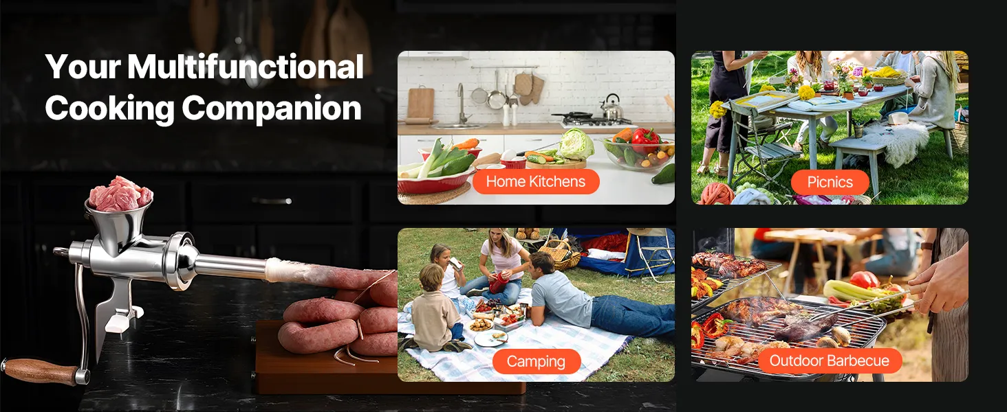 Viegls un kompakts, šis manuālais desu gatavotājs ir ideāli piemērots virtuvei, piknikiem, āra grilēšanai un kempinga braucieniem. Pārvērtiet jebkuru vietu par savu radošās gatavošanas zonu un izbaudiet mājās gatavotu maltīšu prieku.