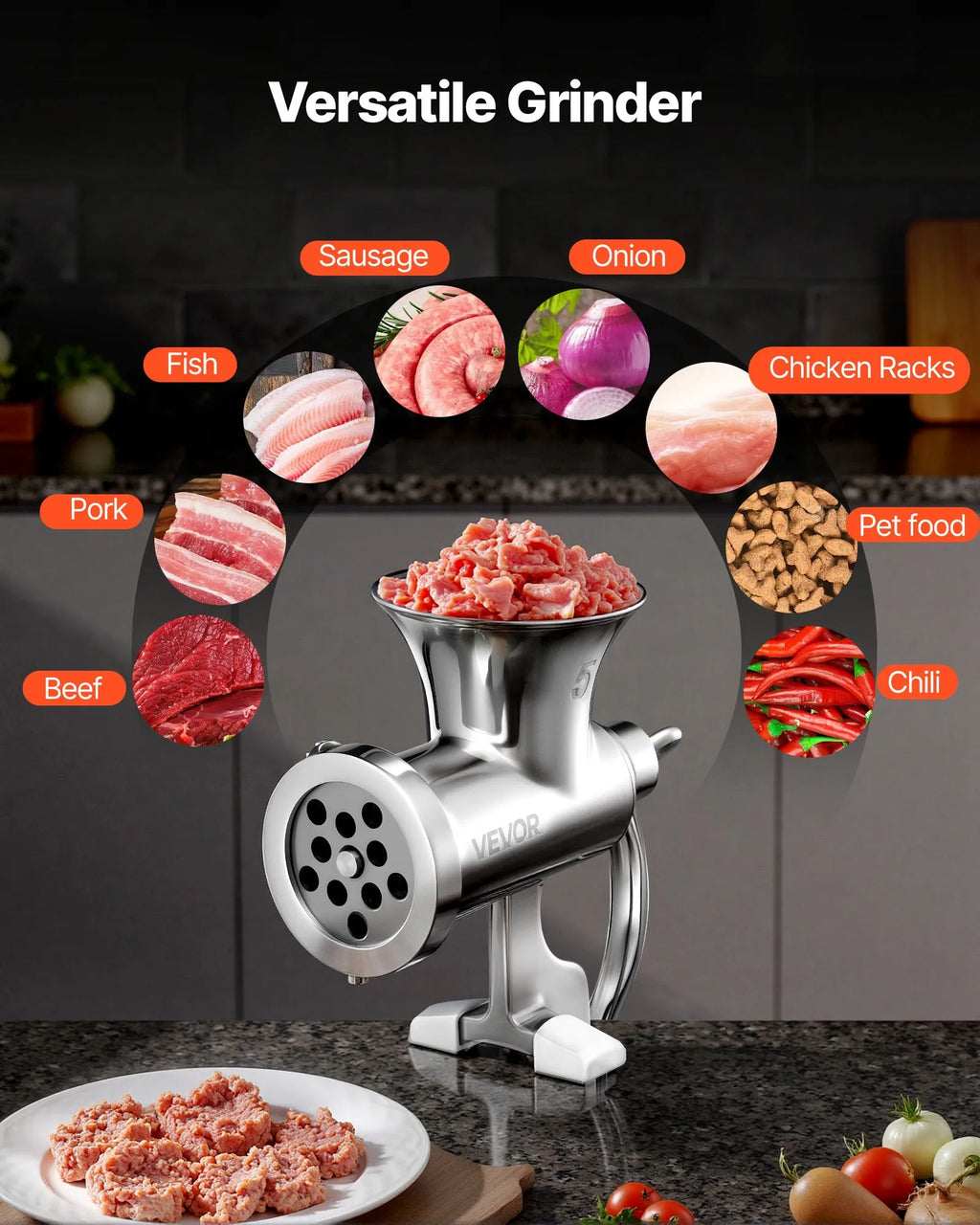 Daudzpusīgs gatavošanas palīgs: Maliet liellopu, cūkgaļu, vistas gaļu, zivis, nelielus kaulus, dārzeņus un čili piparus. Piemērota ģimenes maltītēm, veselīgai barībai mājdzīvniekiem un visu uztura vajadzību nodrošināšanai. Komplektā esošie desu piederumi ļauj viegli un jautri gatavot desas.