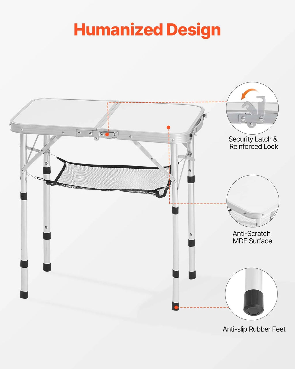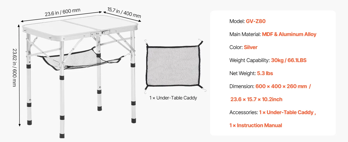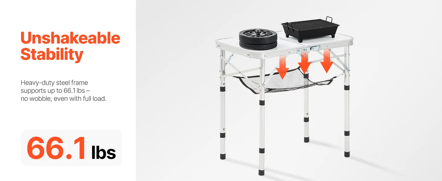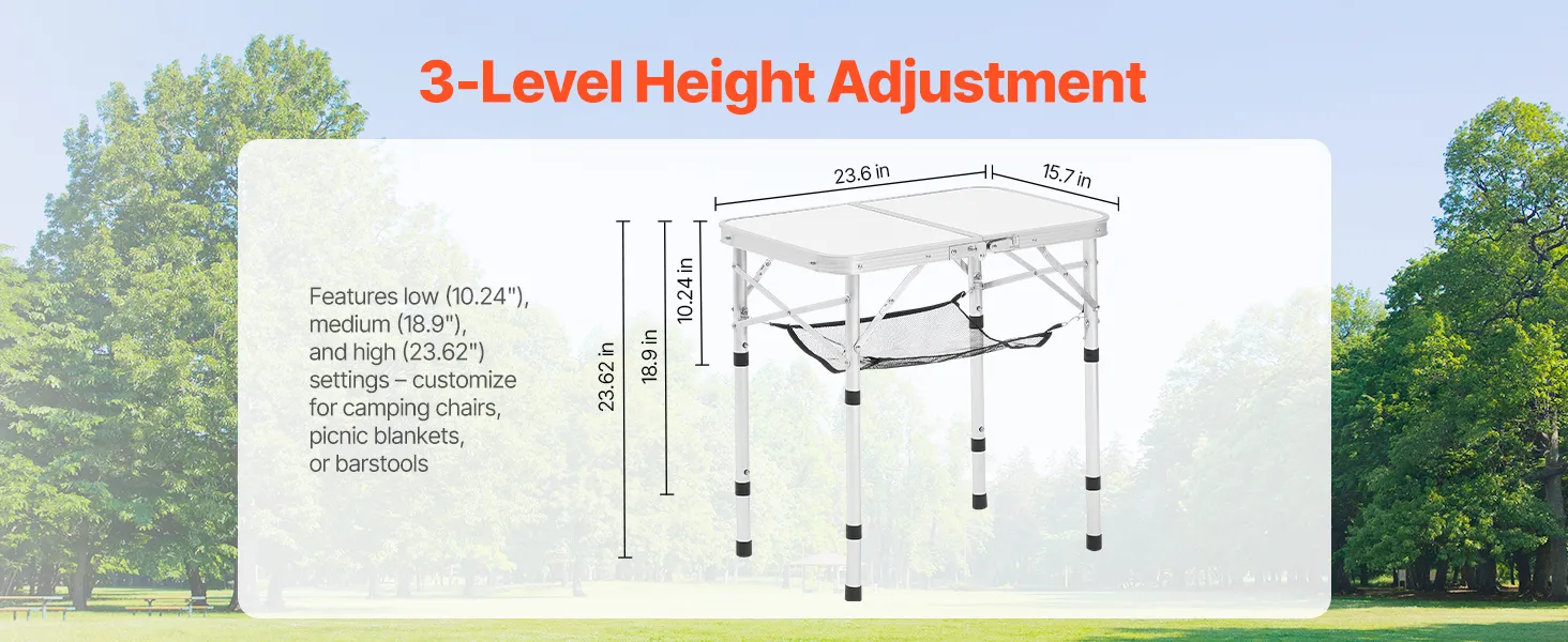 Trīs augstuma līmeņi: Kempinga galdam ir regulējamas kājas ar trīs augstuma pozīcijām — 26 / 48 / 60 cm. Galda virsma 60 × 40 cm ir piemērota 2–4 personām, ideāla vakariņām, nelielām sanāksmēm vai vieglam darbam.