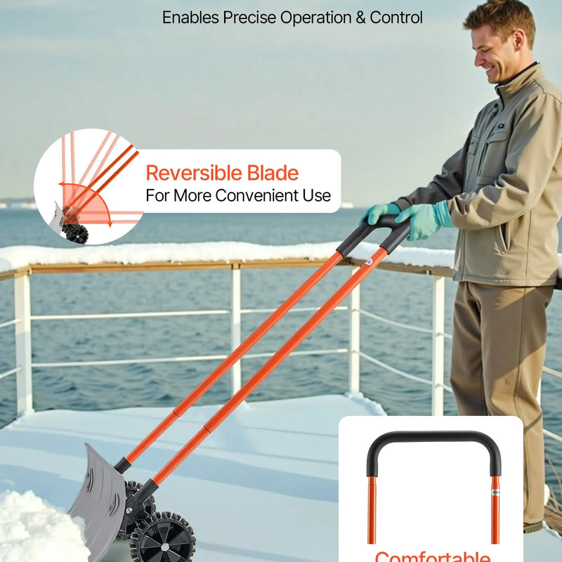 Regulējams kāts: sniega lāpstai ir 90° regulējams kāts, kas ļauj viegli pielāgot to vēlamajam leņķim. Neatkarīgi no tā, vai stumjat sniegu vai tīriet stūrus, tas nodrošina lielāku precizitāti un kontroli efektīvākai sniega tīrīšanai.