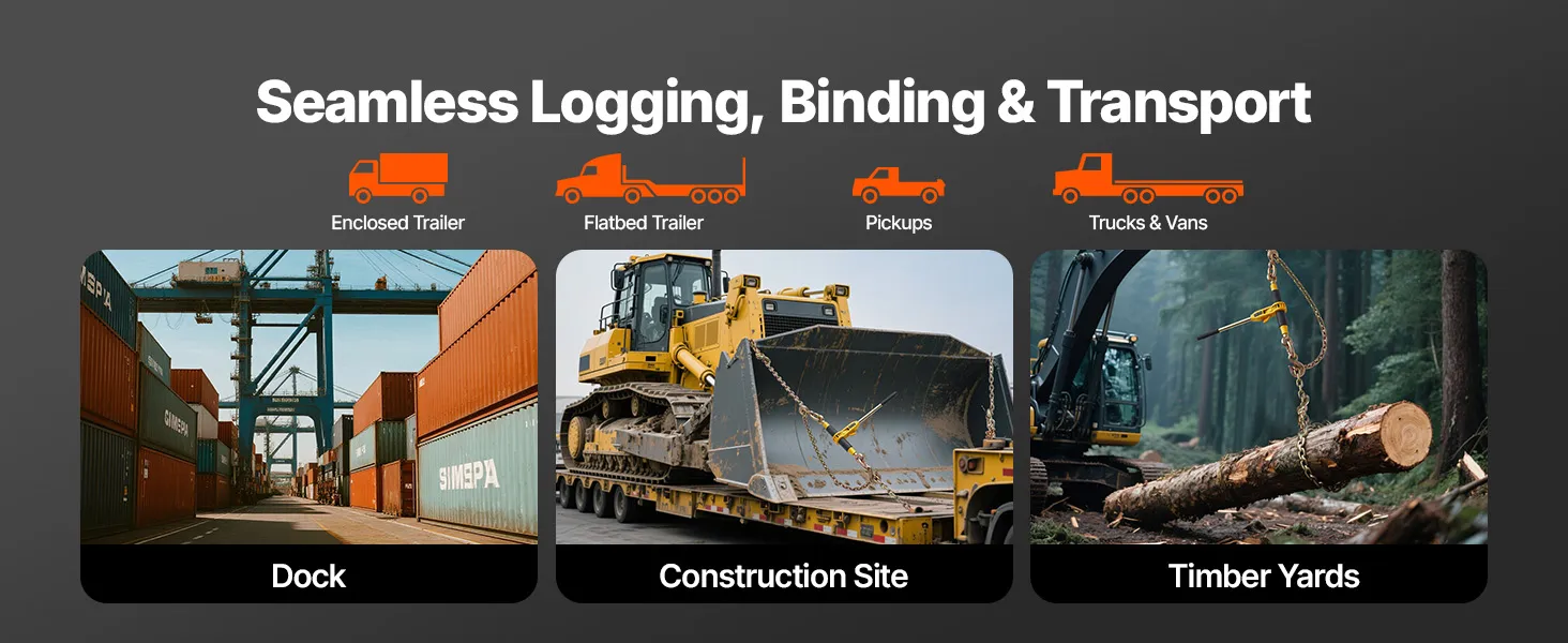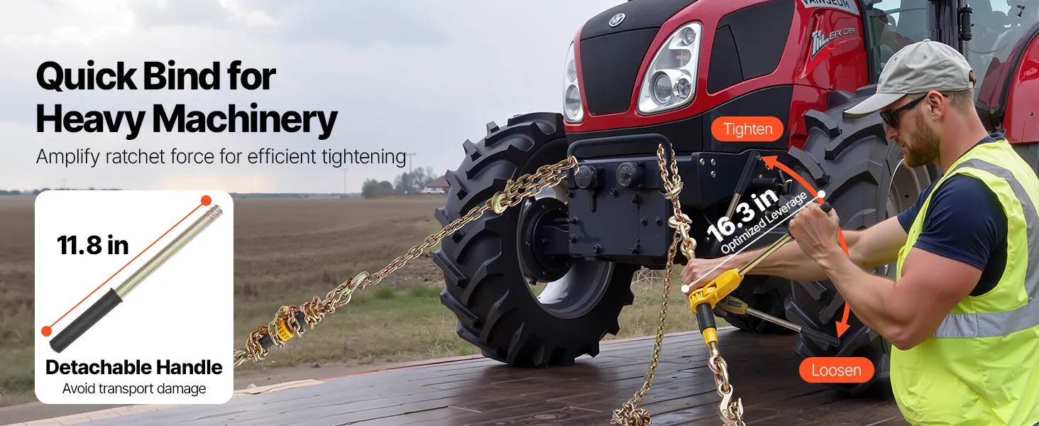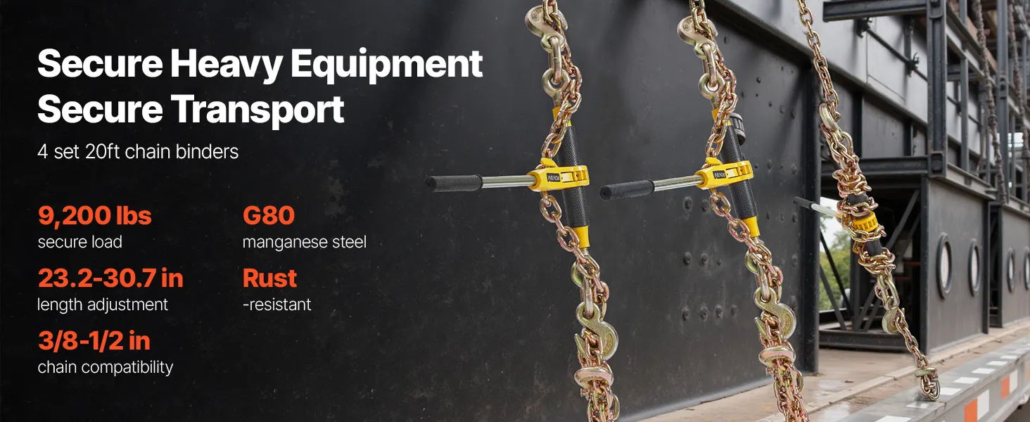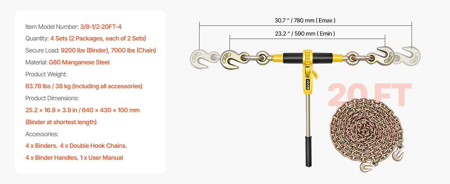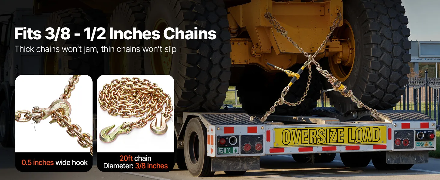 Saderība un pielāgojamība: komplektā ietilpst 6,1 m G80 ķēde (10 mm diametrs). Savilcējs piemērots 10-13 mm ķēdēm ar regulējamu āķu attālumu 590-780 mm diapazonā. Ideāli piemērots kravas automašīnām, celtņiem un pikapiem kokmateriālu, tehnikas un citu kravu nostiprināšanai