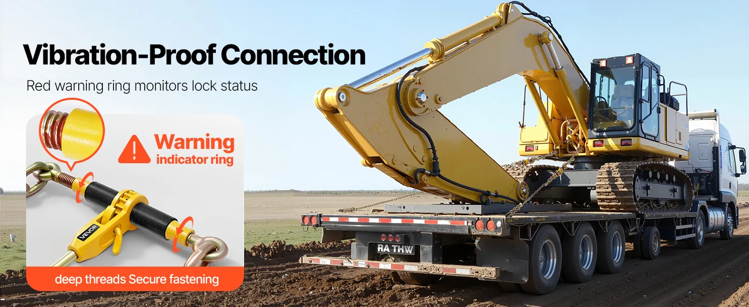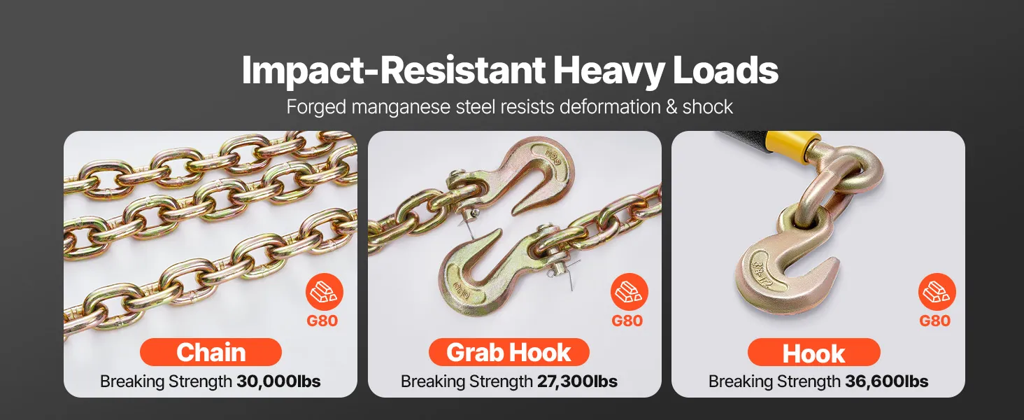 Liela slodzes ietilpība: šis smagās klases savilcējs izgatavots no augstas temperatūras kalta tērauda, nodrošinot maksimālu izturību. Tas spēj nostiprināt kravas līdz 4173 kg, savukārt G80 mangāna tērauda detaļas nodrošina trīskāršu aizsardzību pret lūzumu