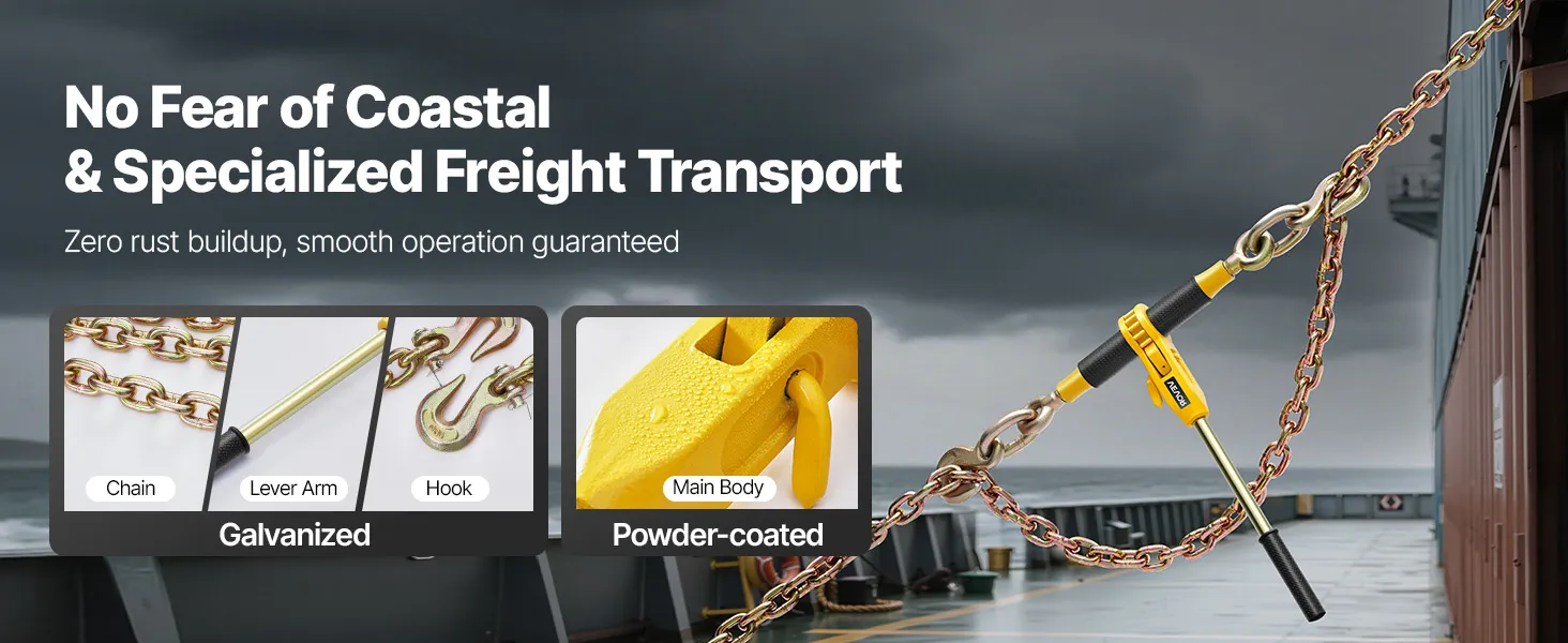 Izgatavots no pilnībā tērauda konstrukcijas, mūsu ķēdes savilcējs iztur līdz 4173 kg, padarot to ideāli piemērotu industriālajam transportam. Комплект из 6,1 м G80 ķēde, kas atrisina saderības un svara problēmas, ar kādām sastopas tradicionālie nostiprinātāji.