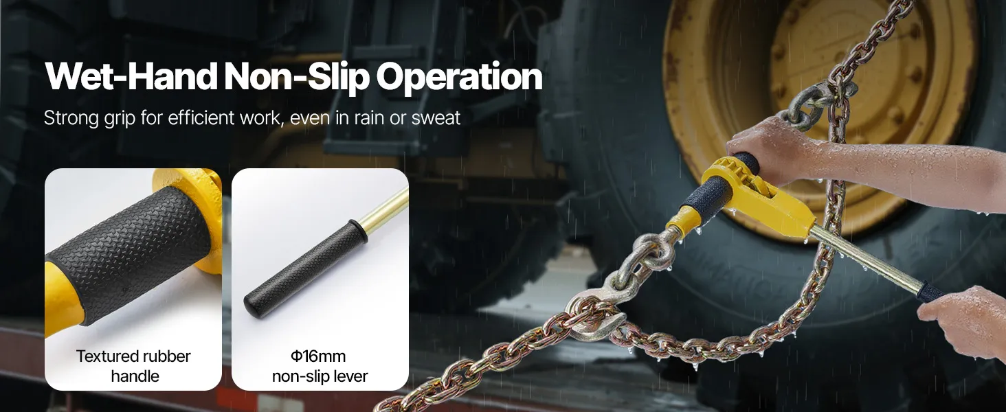 A: Regulējams no 590 mm (min) līdz 780 mm (maks). Piemērots 10-13 mm ķēdēm - ideāli kokmateriālu nostiprināšanai, kravu pārvadāšanai un transportēšanai.