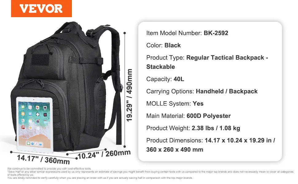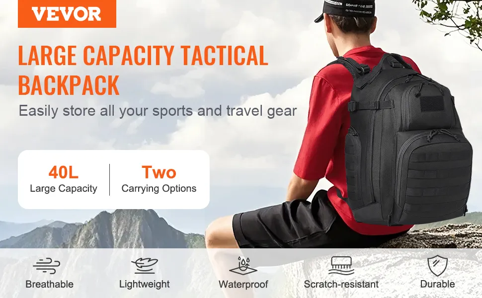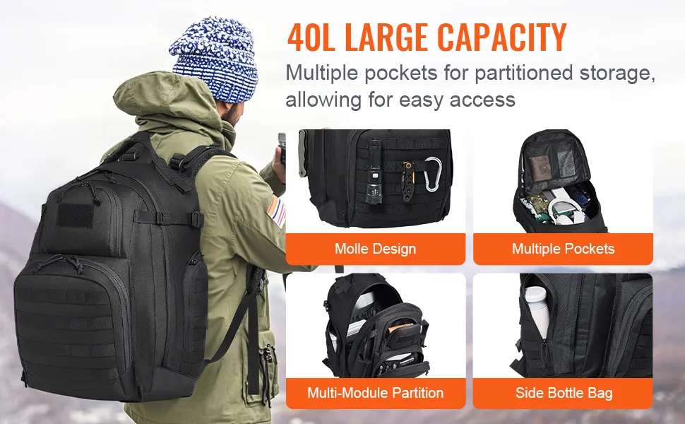Militārā taktiskā mugursoma ir 360 mm gara, 260 mm plata un 490 mm augsta, piedāvājot kopējo tilpumu 40 litri. Tā viegli ietilpina sporta ekipējumu, apģērbu, apavus un citus priekšmetus, kas nepieciešami treniņiem vai ceļošanai, pilnībā atbilstot ikdienas un aktīvās atpūtas vajadzībām.