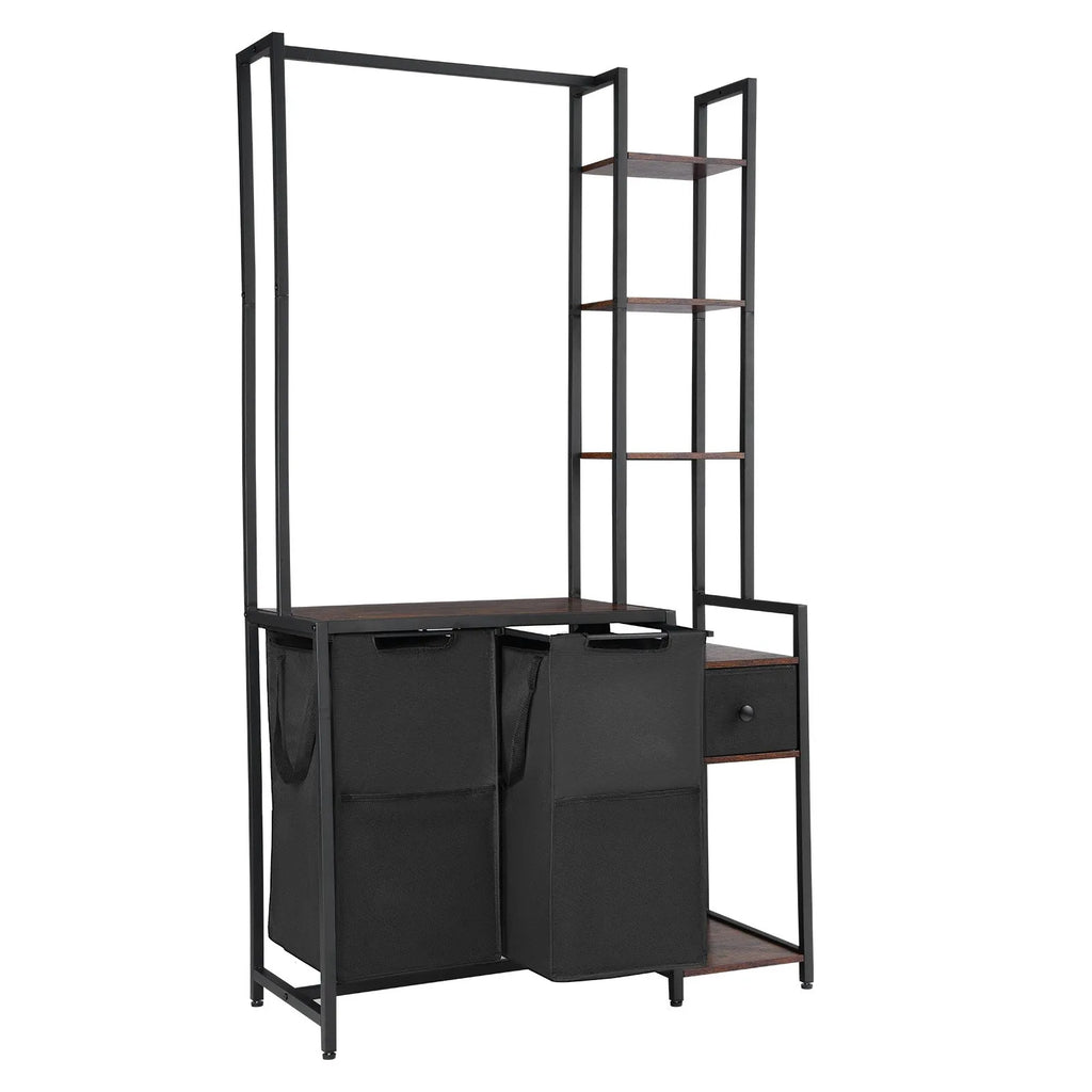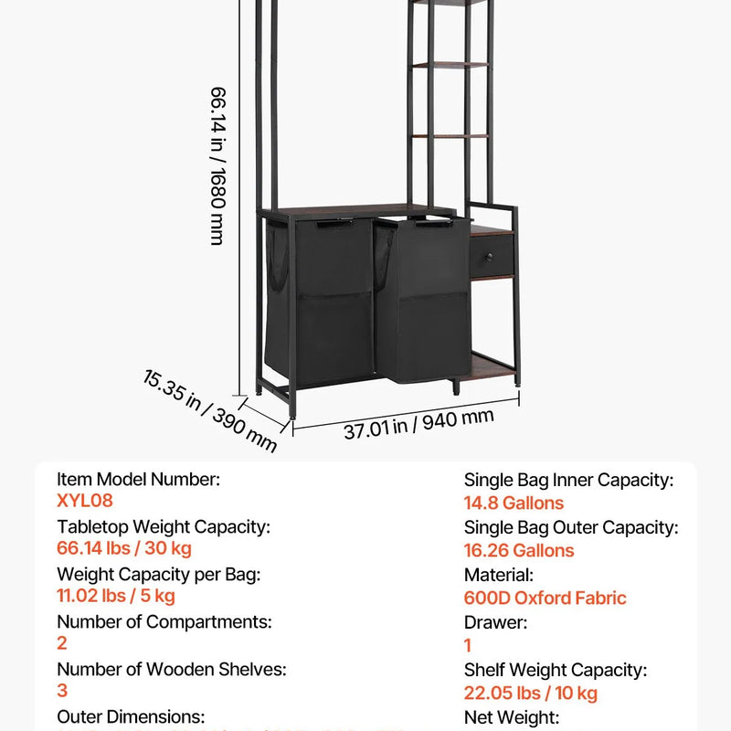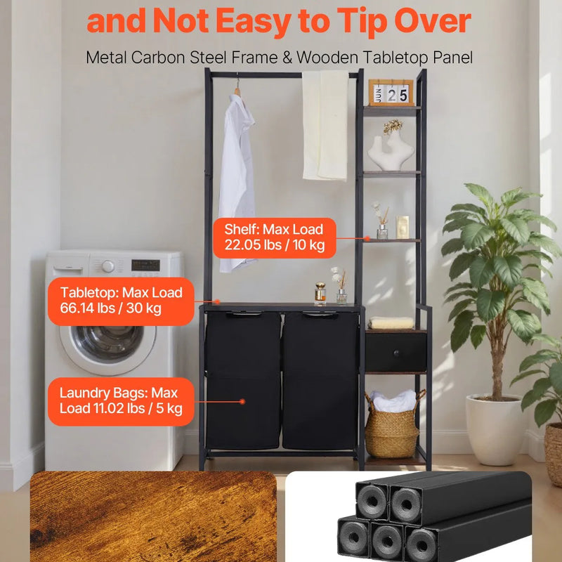 Daudzfunkcionāls dizains: Veļas šķirotāja augšdaļā ir 12 mm bieza skaidu plātne ar 30 kg kravnesību. To var izmantot kā virsmu gludināšanai vai uzglabāšanas vietu veļas piederumiem un nepieciešamajām lietām. Papildus iekļauta metāla stienis, kas piemērots drēbju vai dvieļu pakarināšanai.