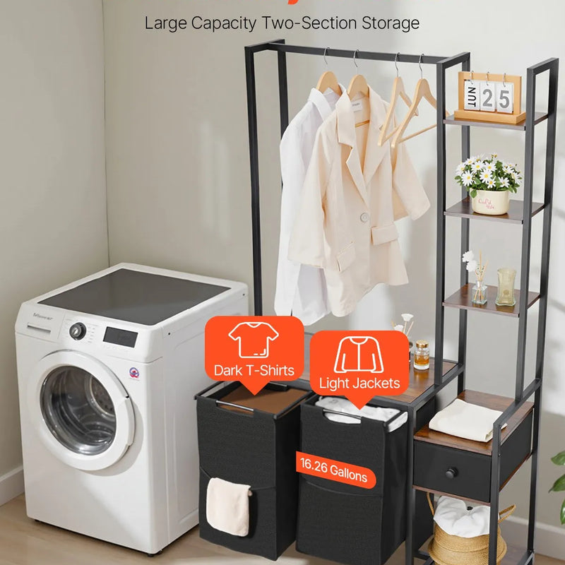 Ērta šķirošana un uzglabāšana: Divi auduma maisi un ārējā kabata nodrošina kopējo tilpumu 123 litri. Ērti atdaliet gaišās un tumšās drēbes, pieaugušo un bērnu apģērbu vai zeķes un dvieļus.