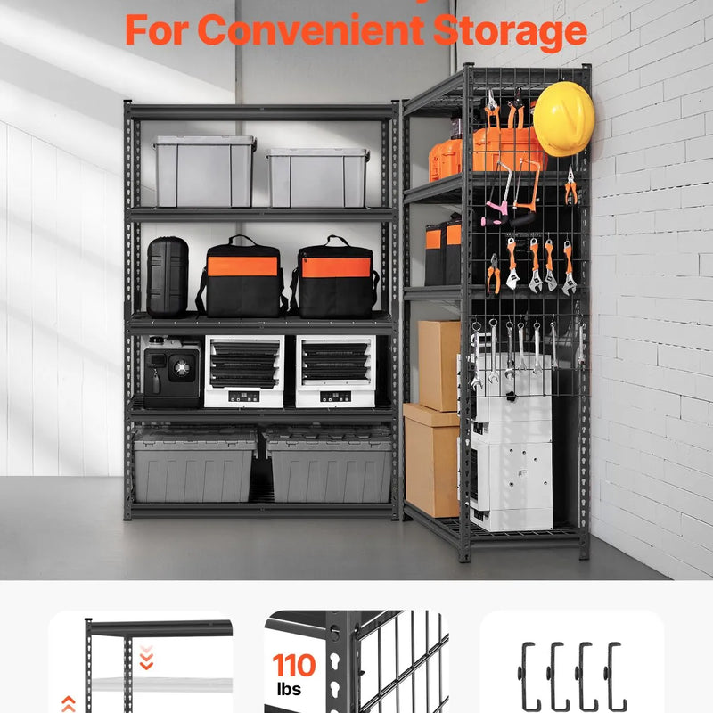 Elastīgs dizains: Regulējams plaukta augstums ļauj uzglabāt dažāda izmēra priekšmetus. Garāžas glabāšanas plaukts aprīkots ar āķiem lieko režģu plākšņu sānu stiprināšanai, paplašinot piekārto uzglabāšanas vietu.