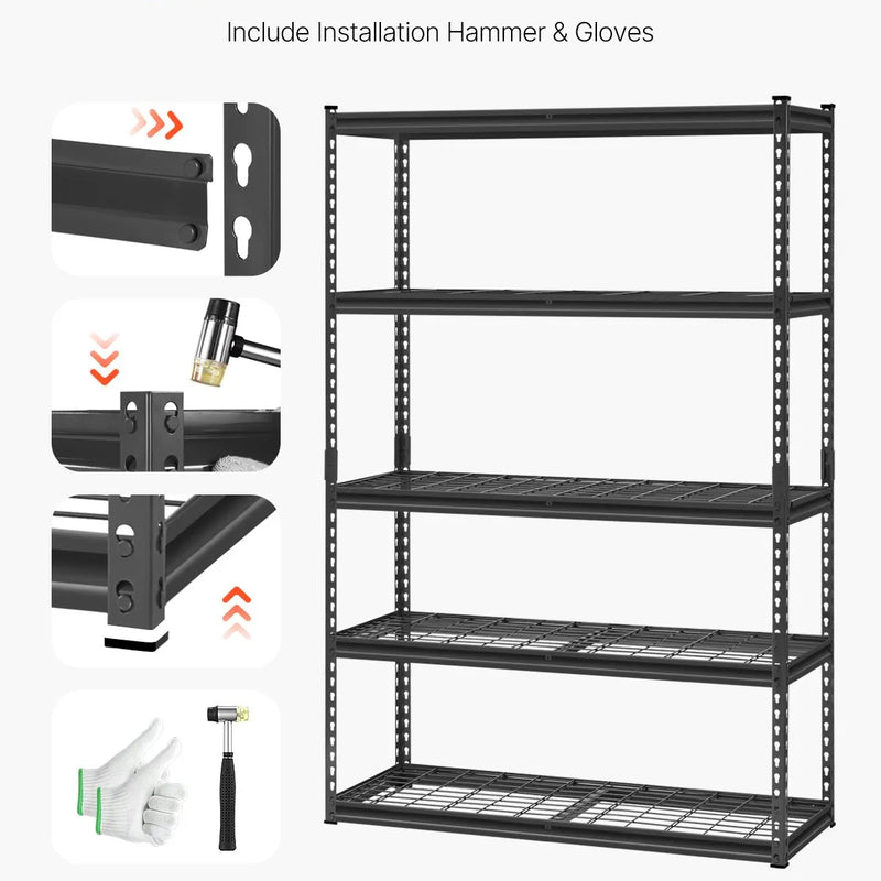 Viegla montāža: Garāžas plauktu uzstādīšana ir vienkārša un neprasa sarežģītus soļus - pietiek ar vieglu iespiešanu. Komplektā iekļauts gumijas āmurs un cimdi ērtākai montāžai.