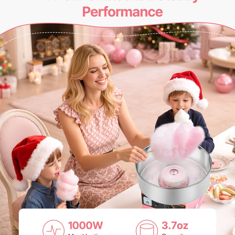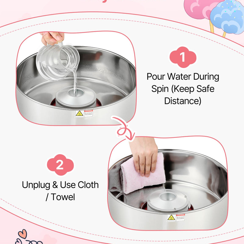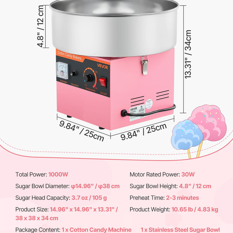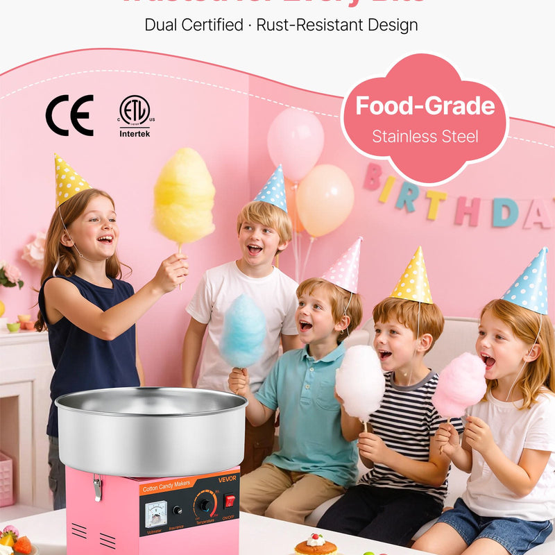 Gudra pārkaršanas aizsardzība: iebūvēts termostats nodrošina aizsardzību pret pārslodzi un pārkaršanu, kamēr cukura galva turpina griezties. Tas samazina bojājumu risku un pagarina vates mašīnas kalpošanas laiku, padarot to ideāli piemērotu mājām, ballītēm un mazām tirdzniecības vietām.