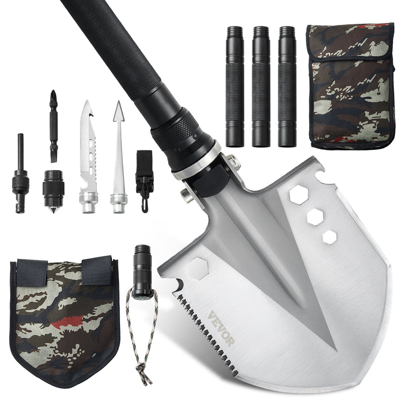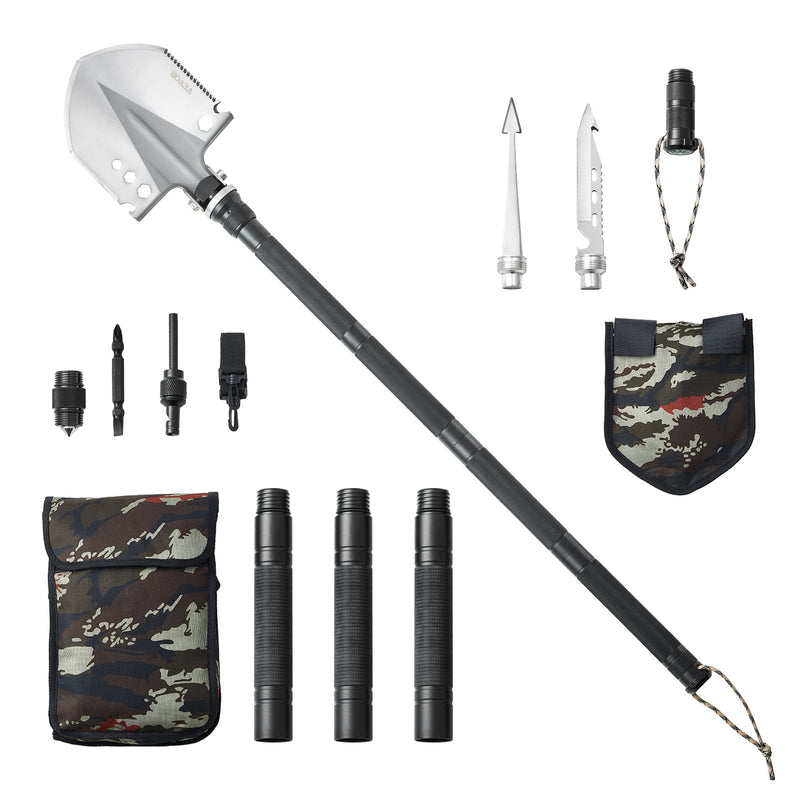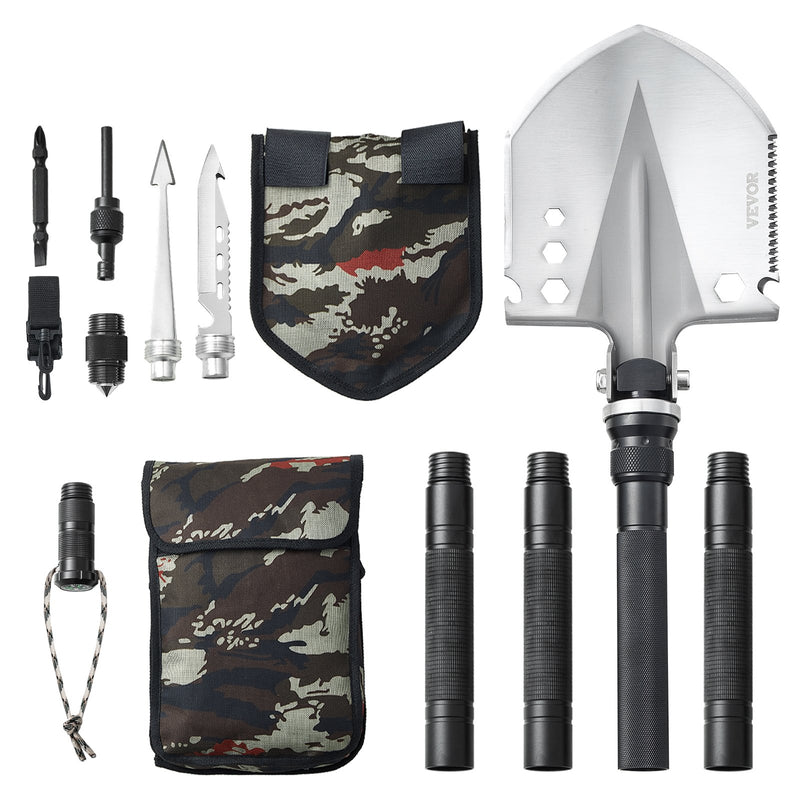 Daudzfunkcionāls kempinga daudzinstrumentu komplekts: Šis izdzīvošanas lāpstas komplekts ietver lāpstu, nazis, kompasu, švilpi, stikla izsistēju, uguns iekurtāju un citas noderīgas funkcijas - ideāli piemērots rakšanai, ciršanai, uguns uzsākšanai, griešanai, signālu došanai un pudeļu atvēršanai. Tas ir jaudīgs rīks ar augstu praktiskumu.