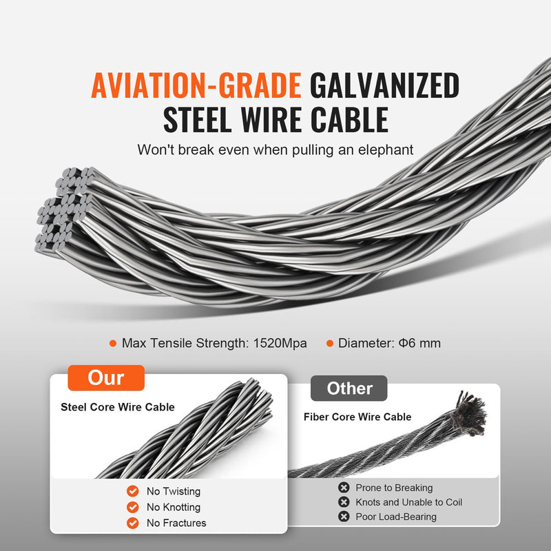 Aviācijas nozares materiāls: Spēks apvienojumā ar izsmalcinātību mūsu jaudīgajā vinčas pacēlāja tērauda trose ir izgatavota no aviācijas nozares tērauda, kas iztur līdz pat 1520 Mpa stiepes spēkam. Atvadieties no sasitumiem un savēlēm, lai pacelšana būtu uzticama un droša.