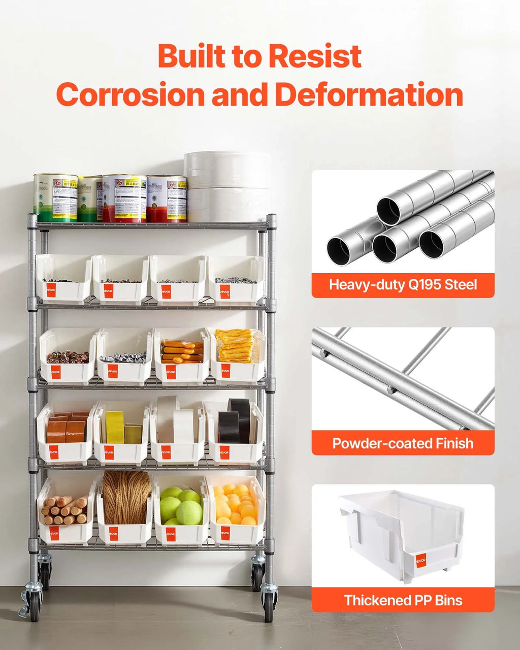 VEVOR 5 līmeņu pārvietojams uzglabāšanas statīvs ar konteineriem, 16 organizēšanas kastes, tērauda stiepļu plauktu sistēma ar riteņiem, mobilais instrumentu un piederumu organizators garāžai, noliktavai, birojam, restorānam, klasei un virtuvei
