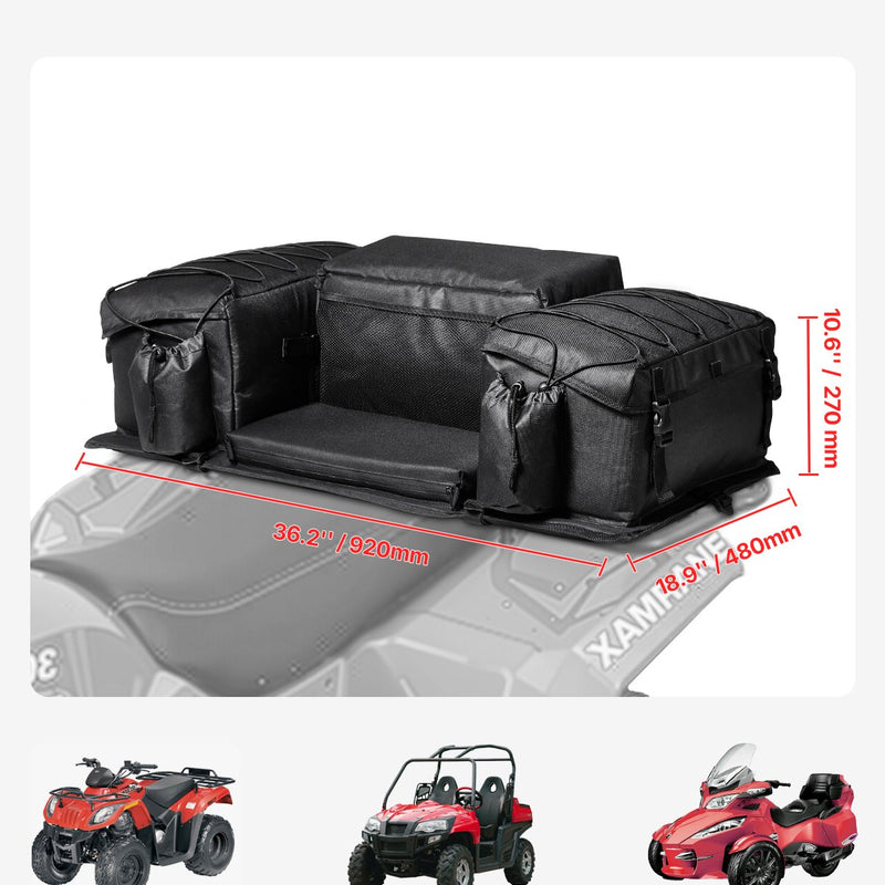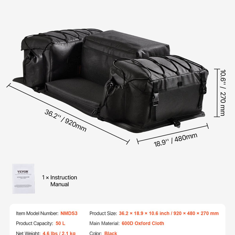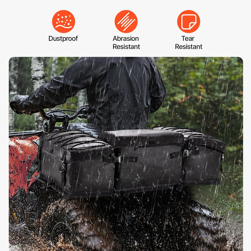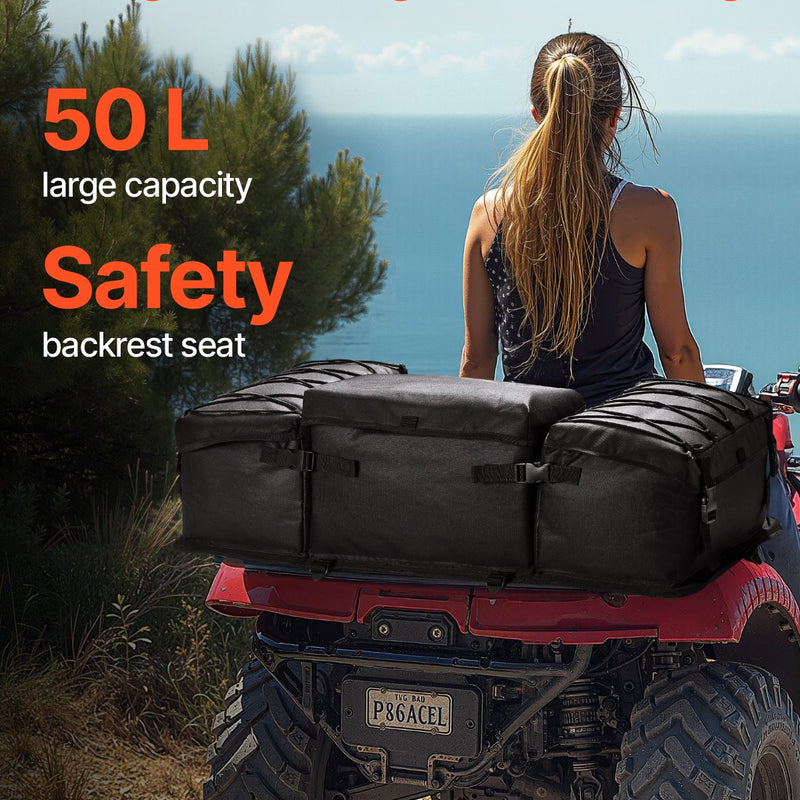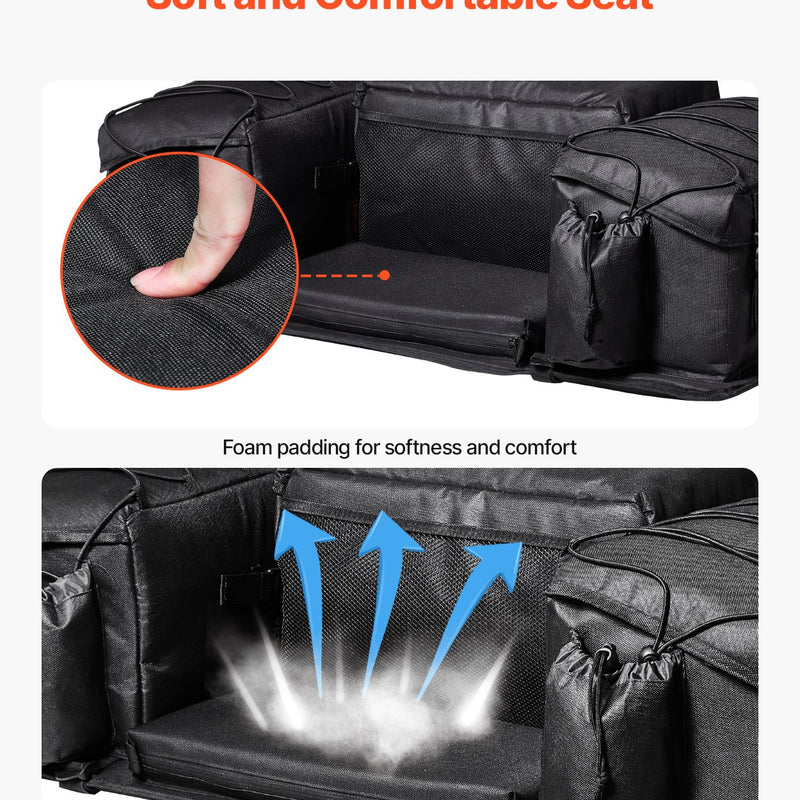 VEVOR ATV aizmugures glabāšanas soma apvieno uzglabāšanu un sēdvietu vienā risinājumā, piedāvājot ietilpīgu 50 L apjomu ķiverēm, cimdiem, instrumentiem un citiem nepieciešamajiem priekšmetiem. Integrētais sēdeklis ir polsterēts ar mīkstu, elpojošu sūkli, nodrošinot augstu komforta līmeni āra piedzīvojumos.