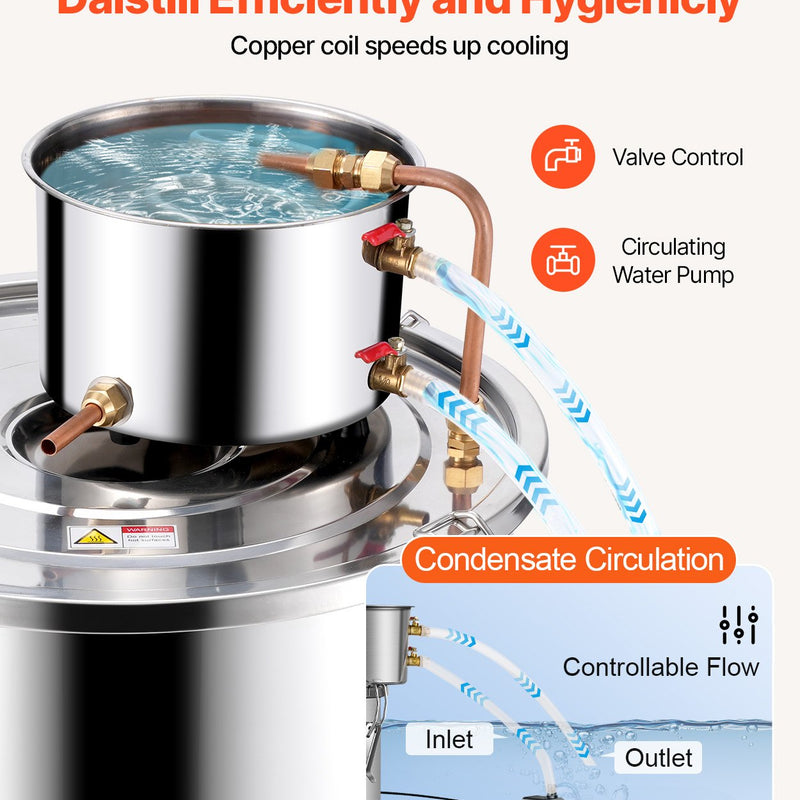 50L destilācijas aparāts ar iebūvētu termometru uz vāka un 8W ūdens cirkulācijas sūkni, šo iekārtu var izmantot augļu vīnu, brendija, degvīna, viskija, etanola, ūdens un ēterisko eļļļu destilācijai.
